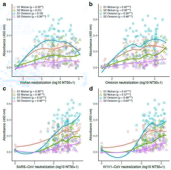 Antibody titers were predominantly positively correlated to pseudovirus neutralization. Binding (measured by ELISA) and neutralizing (measured as 50% neutralization titer; log10 NT50+1 transformation) antibody levels were compared for the 87 study participants. S1-Wuhan-, S2-Wuhan-, S1-Omicron-, and S2-Omicron-specific antibody levels vs. (a) Wuhan pseudovirus neutralization, (b) Omicron pseudovirus neutralization, (c) SARS-CoV pseudovirus neutralization, and (d) WIV1-CoV pseudovirus neutralization. Curves show Loess smoothing as a way to visualize patterns, but the data were analyzed using the Spearman’s rank correlation test with a Benjamini–Hochberg correction for multiple comparisons. Significance was defined as ** Q < 0.01, and *** Q < 0.001.