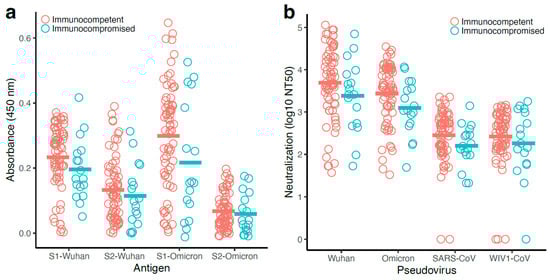 Correlations between neutralization and antibody levels were considerably stronger in the immunocompetent group (Supplementary Figure S5), which had a larger sample size (n = 70) and thus greater statistical power compared to the immunocompromised (n = 17). Here, all 16 correlations were positive, of which 14 were significant. Analyses with the Wuhan pseudovirus had generally lower rank correlation coefficients, although there was a significant correlation for both Wuhan-S1 and -S2-specific antibodies and Omicron-S2-specific antibodies (Spearman’s rank correlation; adjusted p < 0.05; Supplementary Figure S5a). For Omicron, SARS-CoV, and WIV1-CoV pseudoviruses, significant positive rank correlation coefficients were found in all tests (Supplementary Figure S5c,d). The general pattern of stronger rank-based correlations between neutralization and antibody production for S2-specific antibodies, compared with S1-specific counterparts, was found among all participants as well as among immunocompetent participants alone.