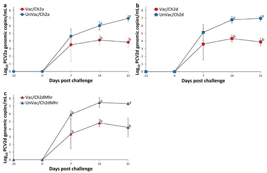Mean genomic copy numbers of PCV2 DNA in serum samples across experimental groups. (a) PCV2a loads in Vac/Ch2a vs. UnVac/Ch2a groups. (b) PCV2d loads in Vac/Ch2d vs. UnVac/Ch2d groups. (c) PCV2d loads in Vac/Ch2dMhr vs. UnVac/Ch2dMhr groups. Variation is expressed as the standard deviation. Different superscripts (a and b) indicate significant differences (p < 0.05) between groups within each pair.