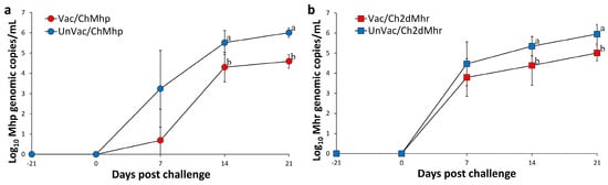 Mean genomic copy numbers of Mycoplasma DNA in challenged pigs. (a) M. hyopneumoniae (Mhp) loads in laryngeal samples of Vac/ChMhp vs. UnVac/ChMhp groups. (b) M. hyorhinis (Mhr) loads in nasal samples of Vac/Ch2dMhr vs. UnVac/Ch2dMhr groups. Variation is expressed as the standard deviation. Different superscripts (a and b) indicate significant differences (p < 0.05) between the two groups in each comparison.