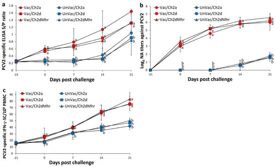 Immune responses against PCV2 in vaccinated and unvaccinated pigs following challenge. (a) Serum PCV2-specific antibody levels measured by ELISA in Vac/Ch2a, Vac/Ch2d, Vac/Ch2dMhr, UnVac/Ch2a, UnVac/Ch2d, and UnVac/Ch2dMhr groups. (b) Serum neutralizing antibody (NA) titers against PCV2 in the same groups. (c) Numbers of interferon-γ-secreting cells (IFN-γ-SC)/106 PBMCs in response to PCV2 antigen stimulation across the six groups. Variation is expressed as the standard deviation. Different superscripts (a and b) indicate significant differences (p < 0.05) between groups.