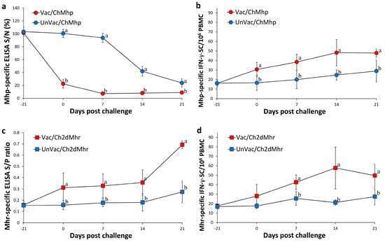 Immune responses against Mycoplasma hyopneumoniae (Mhp) and M. hyorhinis (Mhr) in vaccinated and unvaccinated pigs following challenge. (a) Serum antibody levels against Mhp in Vac/ChMhp vs. UnVac/ChMhp groups. (b) IFN-γ-secreting cells (IFN-γ-SC)/106 PBMCs in response to Mhp stimulation in Vac/ChMhp vs. UnVac/ChMhp groups. (c) Serum antibody levels against Mhr in Vac/Ch2dMhr vs. UnVac/Ch2dMhr groups. (d) IFN-γ-secreting cells (IFN-γ-SC)/106 PBMCs in response to Mhr stimulation in Vac/Ch2dMhr vs. UnVac/Ch2dMhr groups. Variation is expressed as the standard deviation. Different superscripts (a and b) indicate significant differences (p < 0.05) between groups in each comparison.