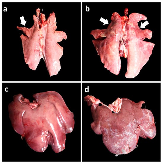 Gross pathological findings in vaccinated and unvaccinated pigs following challenge. (a) Minimal, well-demarcated, dark-red to purple firm parenchyma (arrow) in the lungs of the Vac/ChMhp group. (b) Severe, well-demarcated, dark-red to purple firm parenchyma (arrows) in the lungs of the UnVac/ChMhp group. (c) Minimal fibrinous exudate on the liver surface in the Vac/Ch2dMhr group. (d) Severe fibrinous exudate on the liver surface in the UnVac/Ch2dMhr group.
