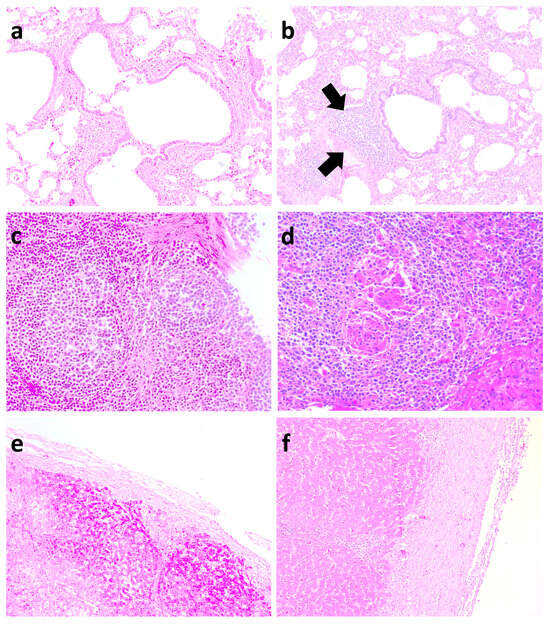 Macroscopically, a minimal fibrinous perihepatic lesion was observed in pigs from the Vac/Ch2dMhr group (Figure 5c). A severe fibrinous perihepatic lesion was observed in pigs from the UnVac/Ch2dMhr group (Figure 5d). Microscopically, a moderate fibrinous perihepatic lesion, covered with moderate non-organized fibrin, was observed in pigs from the Vac/Ch2dMhr group (Figure 6e). Severe fibrinous perihepatic lesion covered with abundant non-organized fibrin was observed in the pigs from the UnVac/Ch2dMhr group (Figure 6f). Pigs in the vaccinated–challenged groups (Vac/Ch2dMhr) had significantly lower (p < 0.05) microscopic fibrinous hepatic lesions compared to unvaccinated-challenged groups (UnVa/Ch2dMhr) at 21 days post challenge (Table 3). Pulmonary, lymphoid, and hepatic lesions were not observed in pigs in the negative control group (UnVac/UnCh).