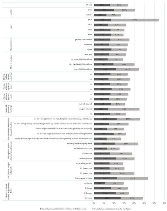 The highest percentage of people declaring influenza vaccination was observed in the 18–24 age group—32.2% (8.5% several times, 23.7% once in the last 3 years). In the remaining age groups, this percentage ranged from 14.7% to 16.1%. A relatively high level of declared influenza vaccination coverage was also observed in the group of people experiencing frequent infections (5 times a year or more)—26.9% (11.5% several times, and 15.4% once). Individuals reporting three or more chronic diseases were also more likely to receive the influenza vaccine—24.3% (13.3% several times and 10.9% once). The lowest vaccination rates were observed among people who believed their health was the same as their peers: 12.7% (6.5% several times and 6.2% once), women: 13.5% (6.2% several times and 7.3% once), and those with the most difficult financial situation: 13.6% (6.4% several times and 7.1% once). Detailed data are presented in Figure 1.