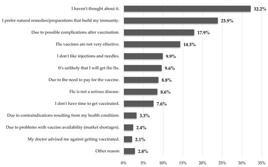 Of all respondents, 83.1% (n = 4157) declared that they had not received an influenza vaccination in the last three years. Of this group, 32.2% indicated that they had not considered it at all. Natural remedies/preparations to build immunity were mentioned by 23.9% of this group. Subsequently, possible side effects (17.9%) and the low effectiveness of flu vaccinations themselves (14.3%) were listed. Detailed data are presented in Figure 2.