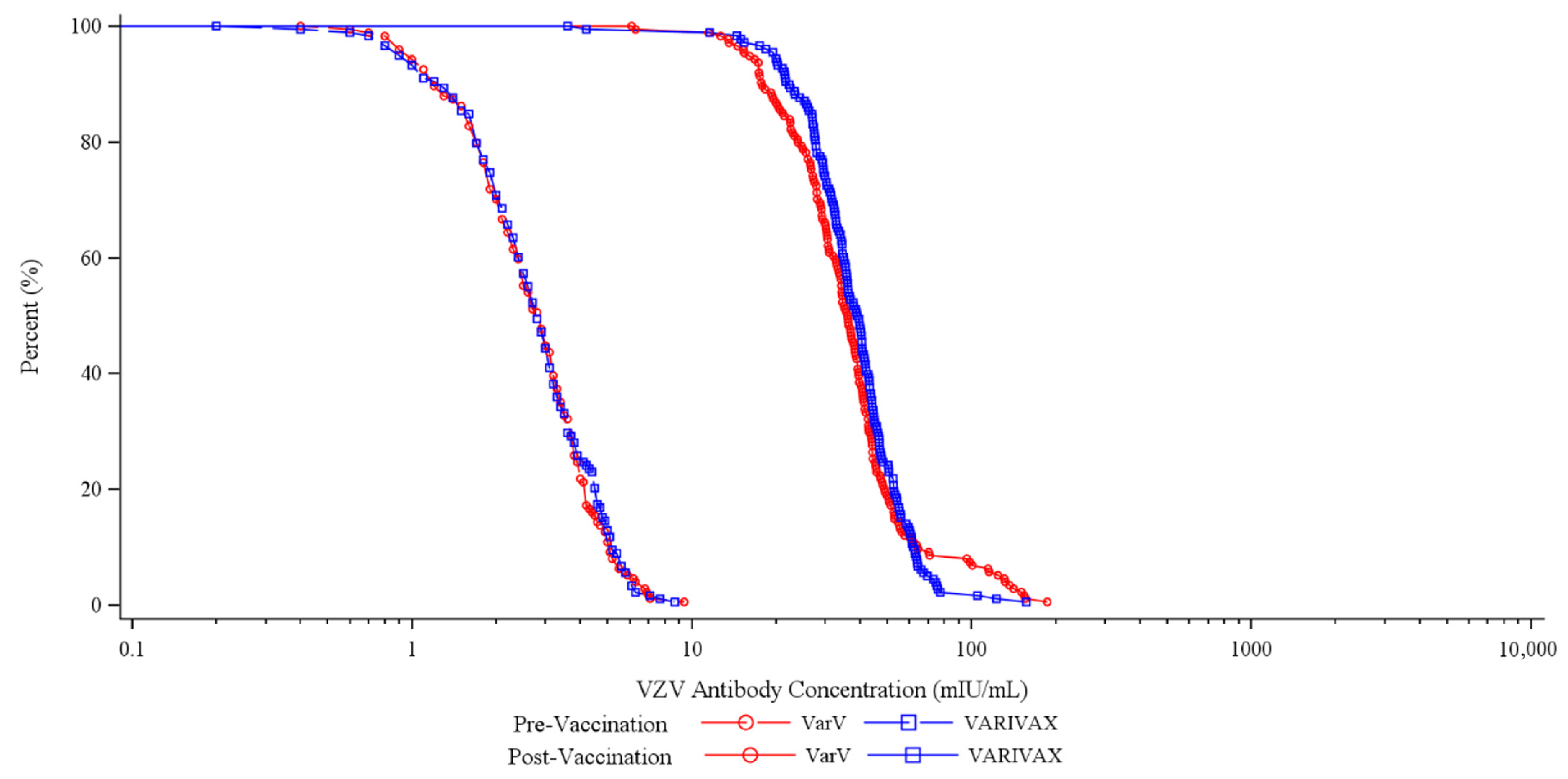 Detailed information of the test vaccine has been published previously. The comparator vaccine, VARIVAX®, contains a minimum of 1350 PFU (3.13 lg PFU) of Oka/Merck varicella virus per dose. All eligible participants received vaccines subcutaneously in the deltoid muscle region of the upper arm.