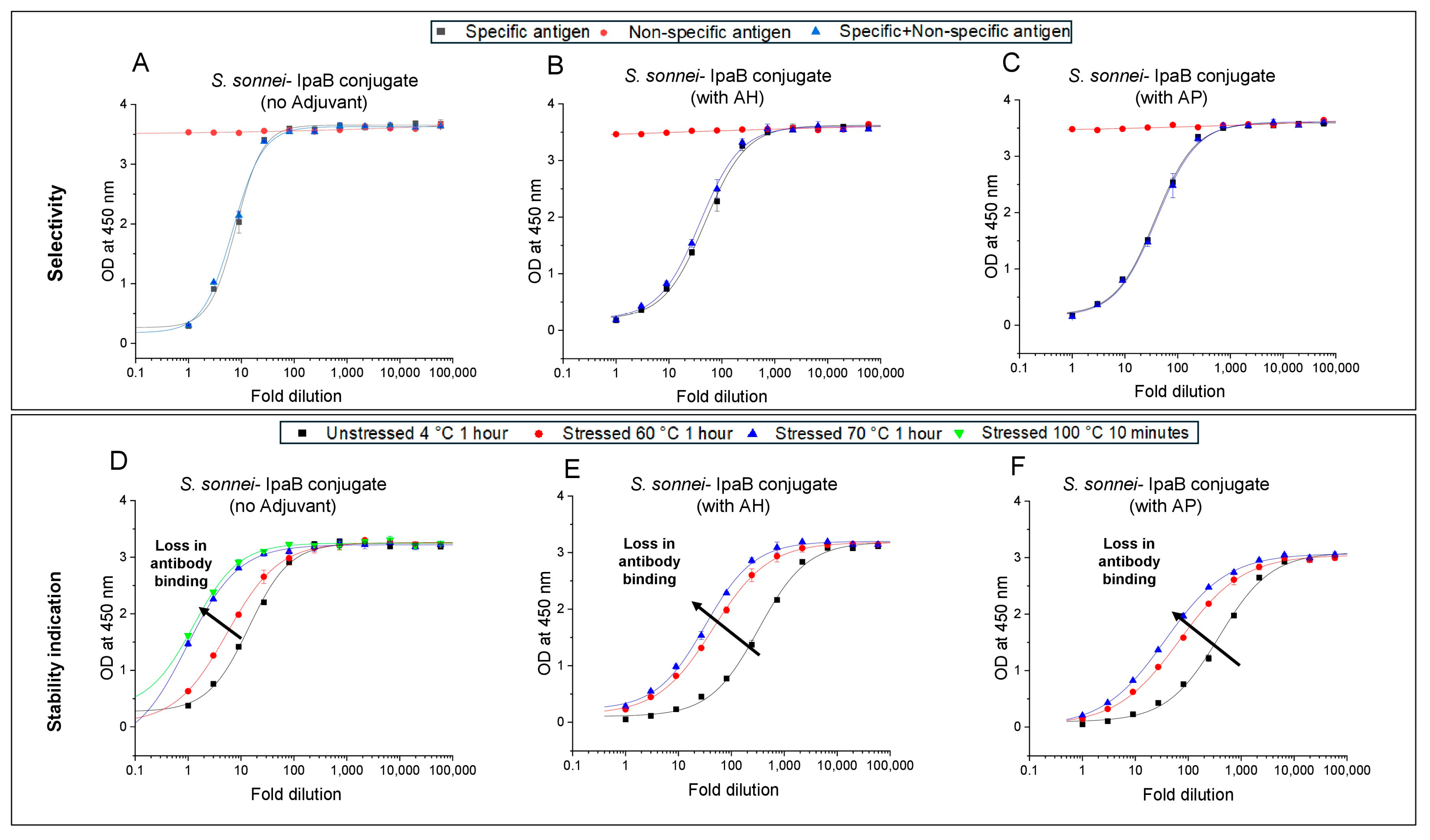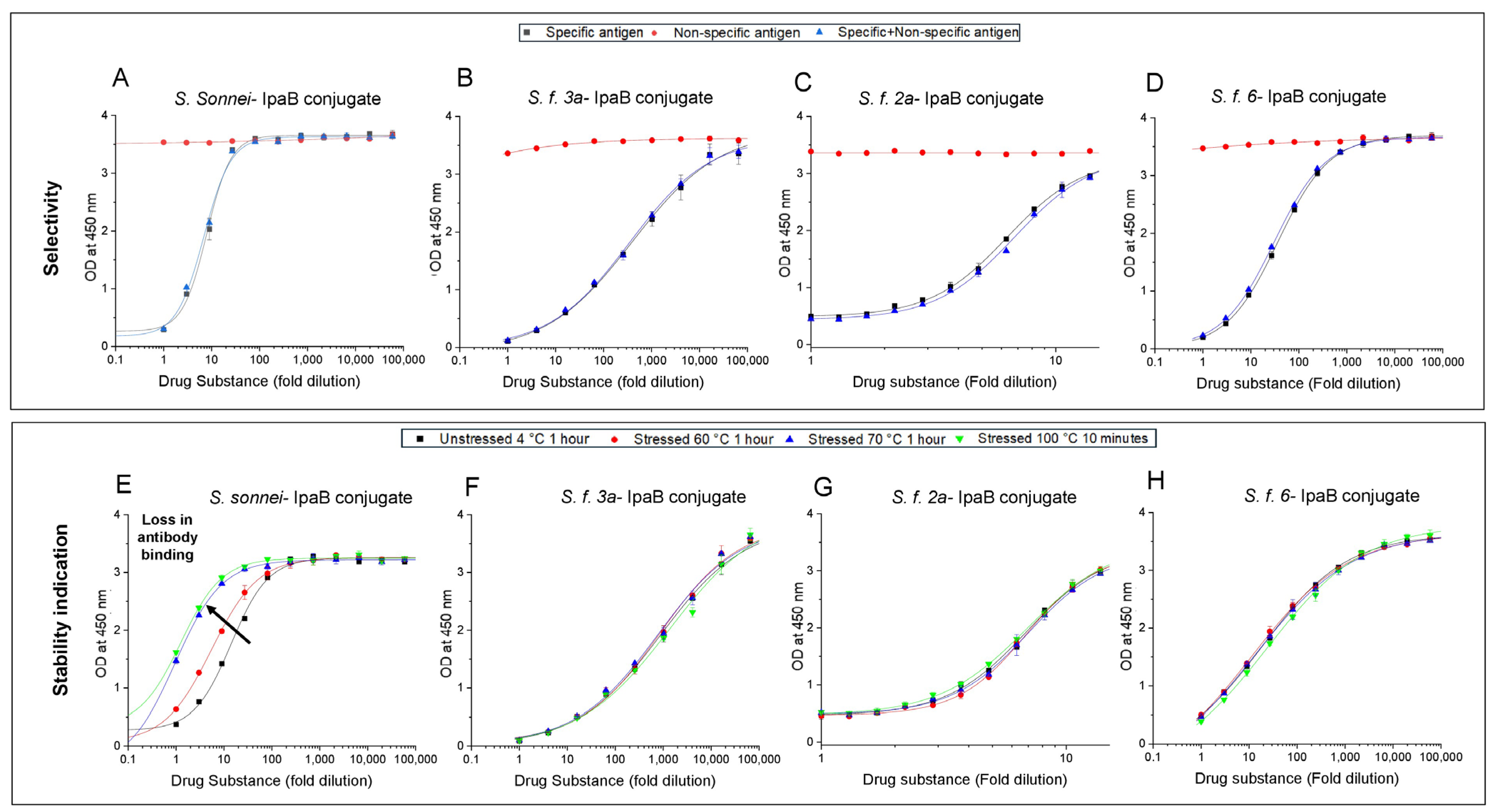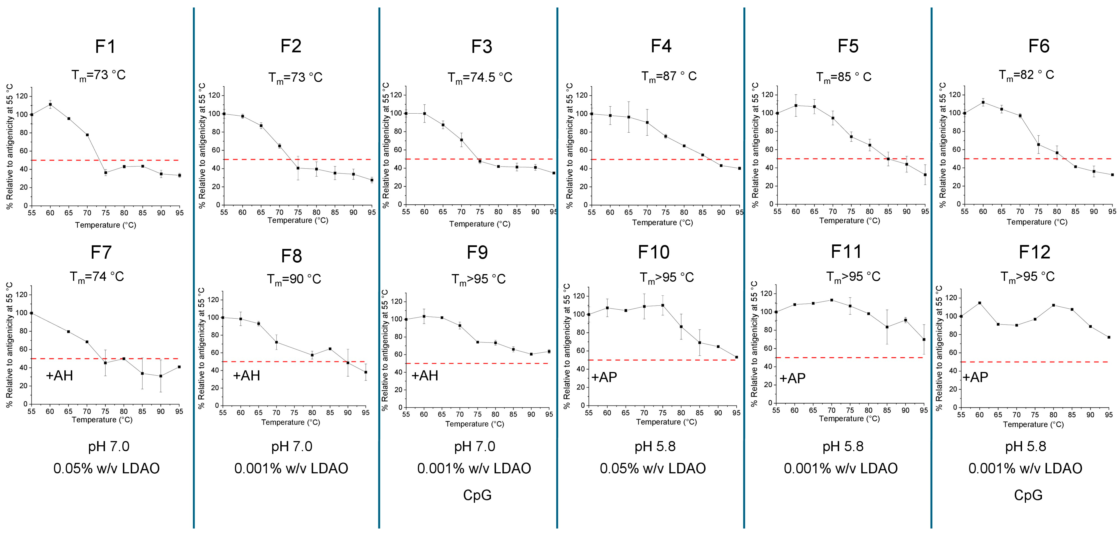 3.7. Preparation of 12 Different Adjuvanted Formulations and Effects of Increasing Temperature Exposure on Antigenicity of S. sonnei O-PS-IpaB Conjugate Antigen