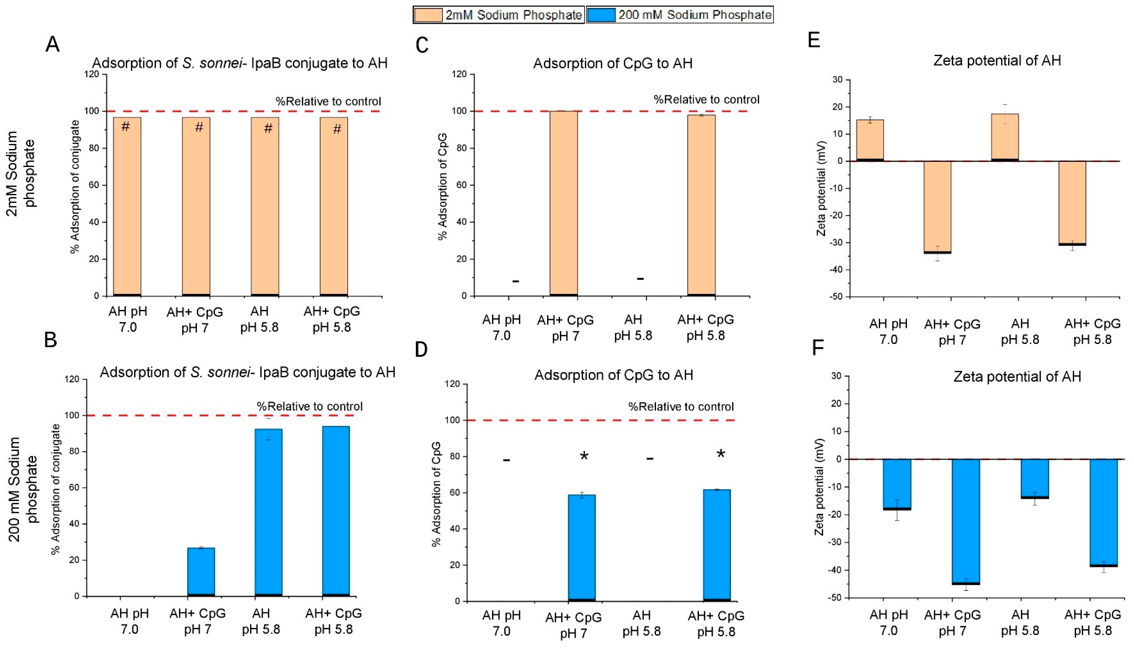 | 2 mM PO4, pH 5.8, CpG | − − | + | yes | Electrostatic interaction with negatively charged CpG or ligand exchange | yes | Antigen binds AH with CpG bound—consistent with electrostatic interactions |