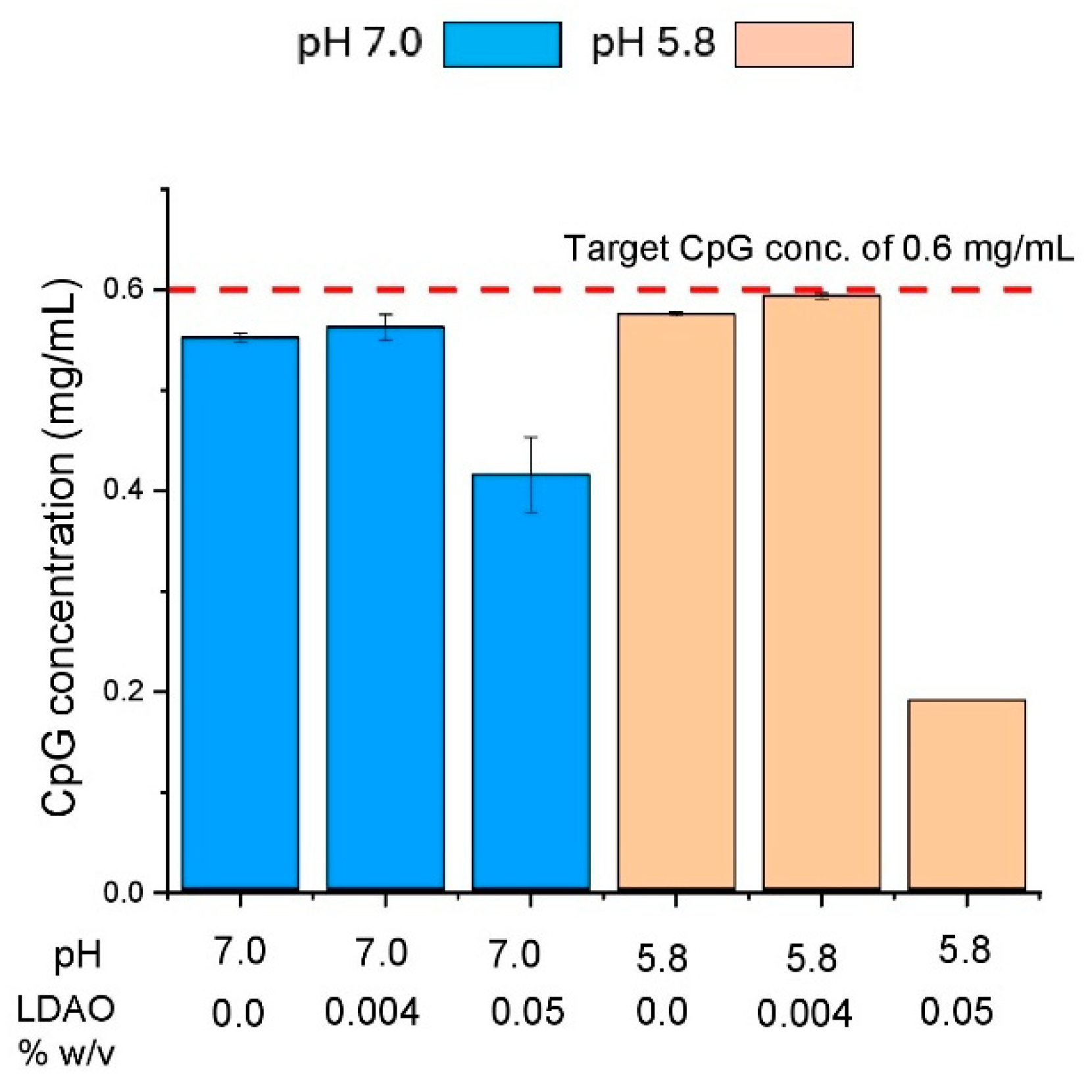 | 200 mM PO4, pH 5.8, CpG | − − − | + | Partial 40%- CpG mass balance loss | no (80%) | Bound part (20%) is consistent with electrostatic interactions, with unbound (80%) potentially from displacement by CpG-LDAO complexes? |