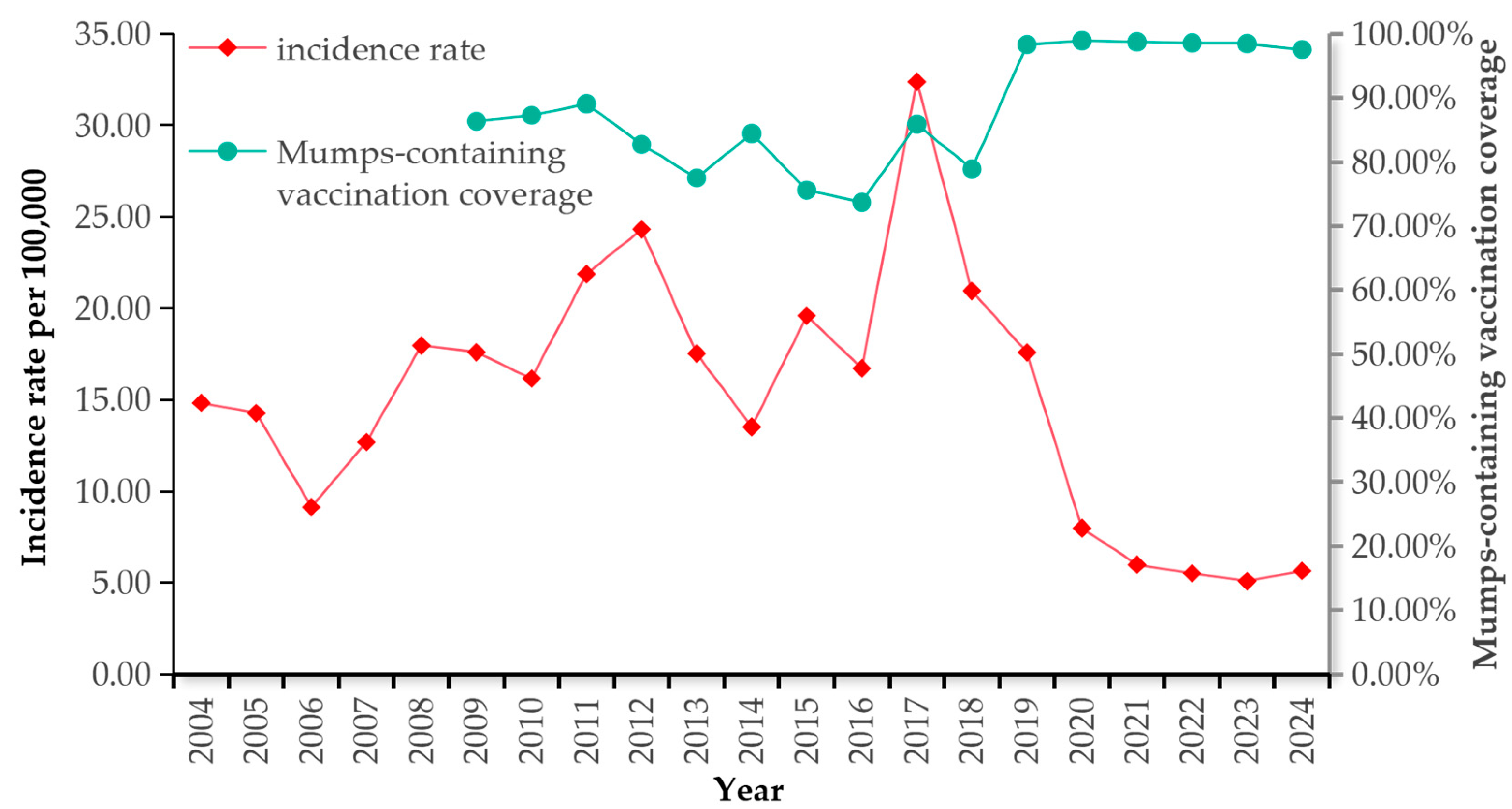 - Pang, H.; Zhou, Y.; Zhao, W.; Jiang, Q. Epidemiological changes in mumps infections between 1990 and 2017 in urban area of Shanghai, China. Hum. Vaccines Immunother. 2021, 17, 1358–1365. [Google Scholar] [CrossRef]