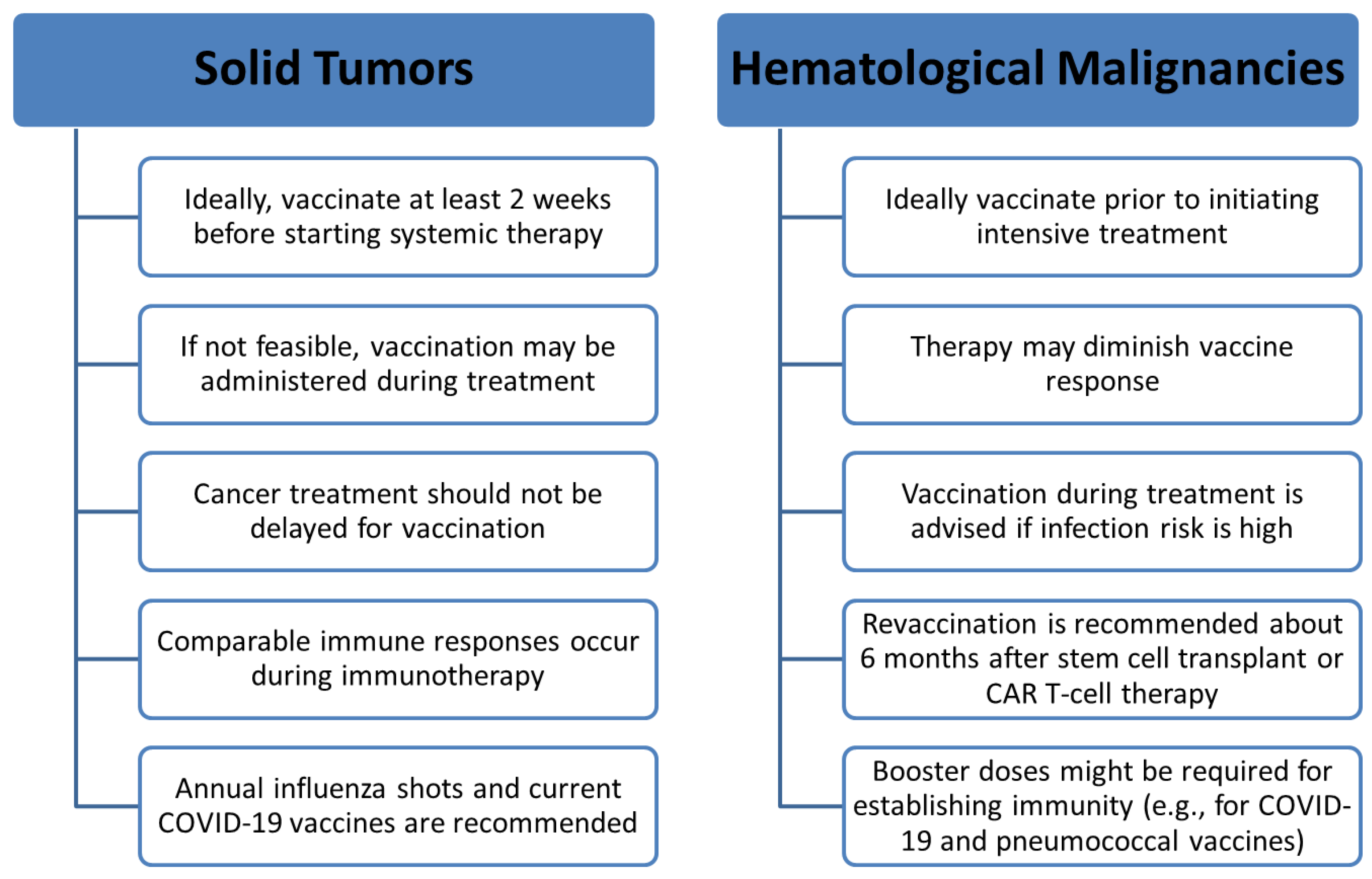 | COVID-19 | mRNA vaccines. Protein subunit vaccines | All adults with cancer. Blunted responses in hematological malignancies. Serology is not routinely recommended to guide boosters | Preferably before systemic therapy. Can be given during active treatment. Avoid same day administration with intensive chemotherapy if possible |