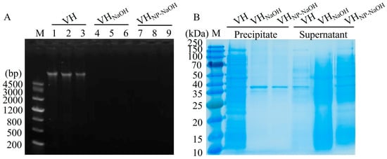 To evaluate the efficiency of cytoplasmic content removal during ghost preparation, residual nucleic acids and proteins in the bacterial ghost samples were analyzed. Genomic DNA was extracted from untreated V. harveyi (VH), NaOH-induced ghosts (VHGNaOH), and NP-40/NaOH-induced ghosts (VHGNP-40/NaOH), followed by agarose gel electrophoresis. As illustrated in Figure 2A, a distinct DNA band was observed in the VH group (lanes 1–3), whereas no visible bands were detected in either the VHGNaOH (lanes 4–6) or VHGNP-40/NaOH groups (lanes 7–9). Quantitative analysis further revealed that the DNA concentrations in VH, VHGNaOH, and VHGNP-40/NaOH were approximately 396.0 ng/µL, 10.5 ng/µL, and 9.4 ng/µL, respectively. These results indicate that both NaOH and NP-40/NaOH treatments effectively facilitated the efflux of intracellular DNA.