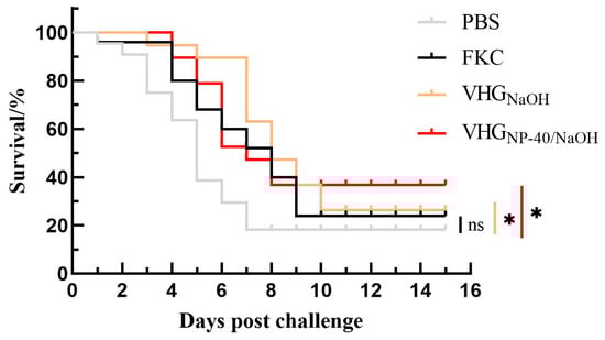 Kaplan–Meier survival curve of vaccinated turbot against a lethal challenge with V. harveyi. Cumulative survival count of fish immunized with PBS, FKC, VHGNaOH, or VHGNP-40/NaOH following intramuscular challenge at 28 d.p.v. ns p > 0.05, * p < 0.05.