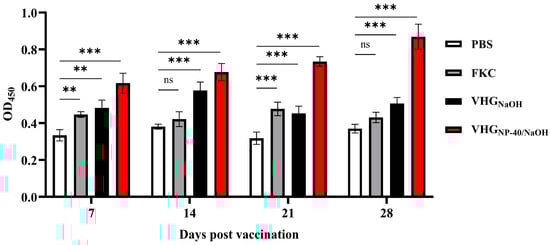 Serum-specific IgM antibody levels in vaccinated turbot. Serum was collected from fish immunized with PBS, FKC, VHGNaOH, or VHGNP-40/NaOH at 7, 14, 21, and 28 d.p.v. Specific antibody levels against V. harveyi were measured by ELISA. Data are presented as mean ± SEM (n = 3). Significance was indicated as: ns p > 0.05, ** p < 0.01 and *** p < 0.001, vaccinated group vs. control group.