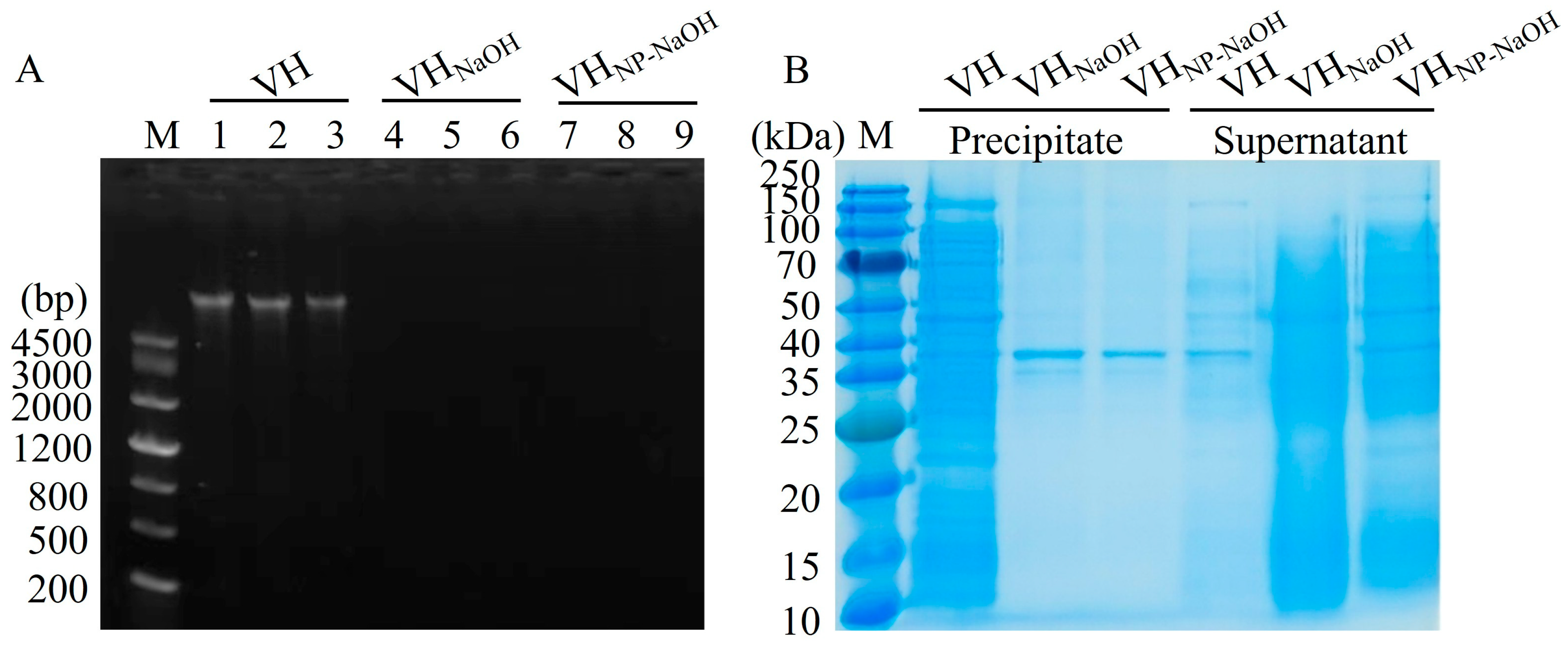 The efficiency of cytoplasmic content removal was assessed by examining the residual nucleic acid and protein in the prepared BGs. DNA retention was evaluated by extracting genomic DNA from untreated VH, VHGNaOH, and VHGNP-40/NaOH using a commercial DNA extraction kit. The extracted DNA was mixed with 10× loading buffer and analyzed by agarose gel electrophoresis to visualize potential DNA residues. For protein analysis, bacterial suspensions of VH, VHGNaOH, and VHGNP-40/NaOH were centrifuged at 8000 rpm for 10 min to separate cell associated fractions (precipitates) from released components (supernatants). All fractions were denatured with 5× protein loading buffer, boiled for 10 min, and subjected to SDS-PAGE. The gels were stained with Coomassie Brilliant Blue to visualize protein patterns and assess the extent of protein release from the bacterial structures.