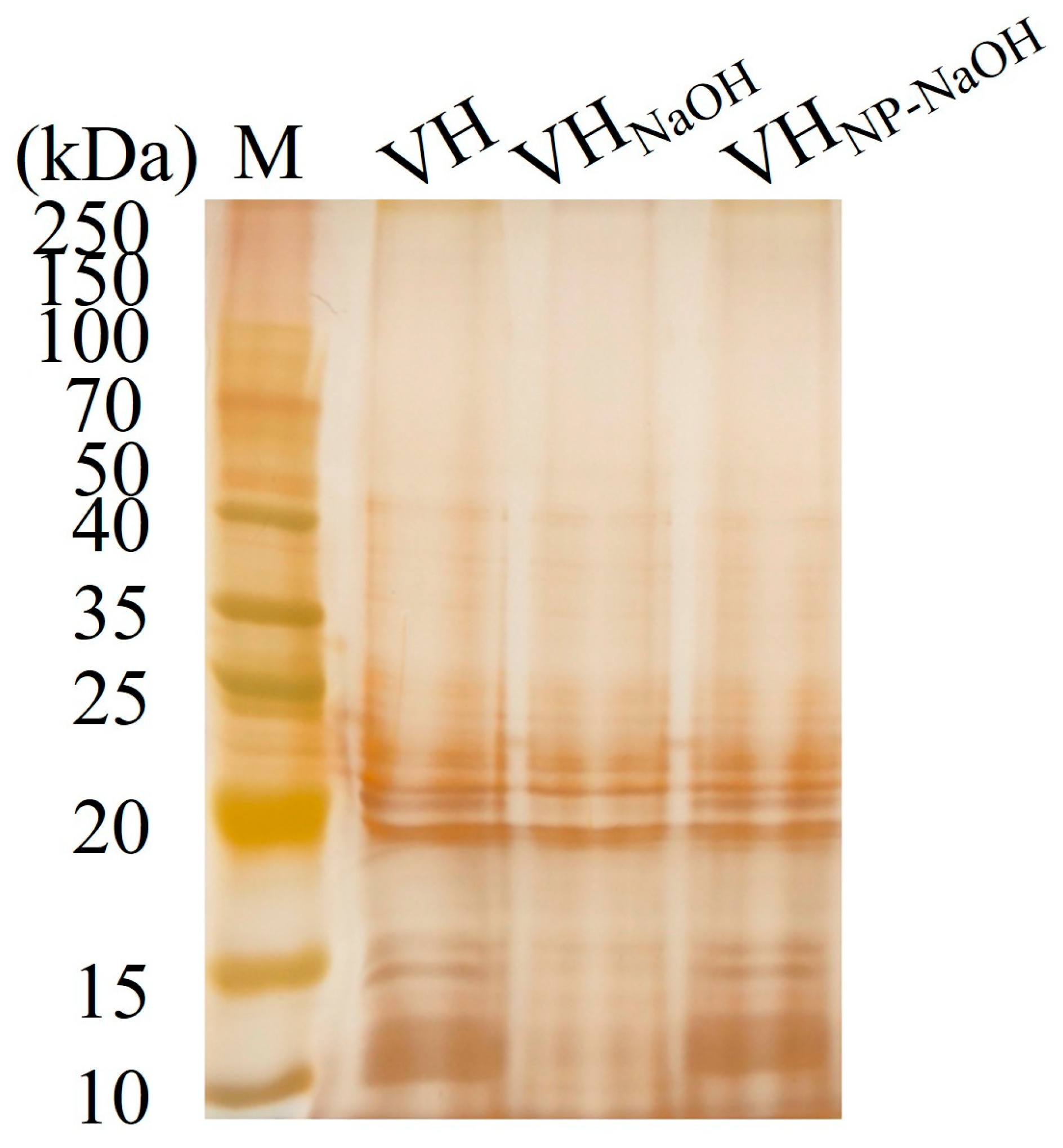 The structural integrity of lipopolysaccharide (LPS) in the BGs was evaluated and compared with that of untreated V. harveyi. LPS was extracted from VH, VHGNaOH, and VHGNP-40/NaOH samples using a commercial LPS extraction kit according to the manufacturer’s instructions. For electrophoresis analysis, the extracted LPS samples were pretreated by mixing with an equal volume of sample buffer containing β-mercaptoethanol, followed by boiling for 5 min. The denatured LPS samples were then separated on a 12.5% polyacrylamide gel using SDS-PAGE. After electrophoresis, the gels were specifically stained with a silver staining kit to visualize the LPS banding patterns, allowing for comparison of LPS structural preservation among the different treatment groups.