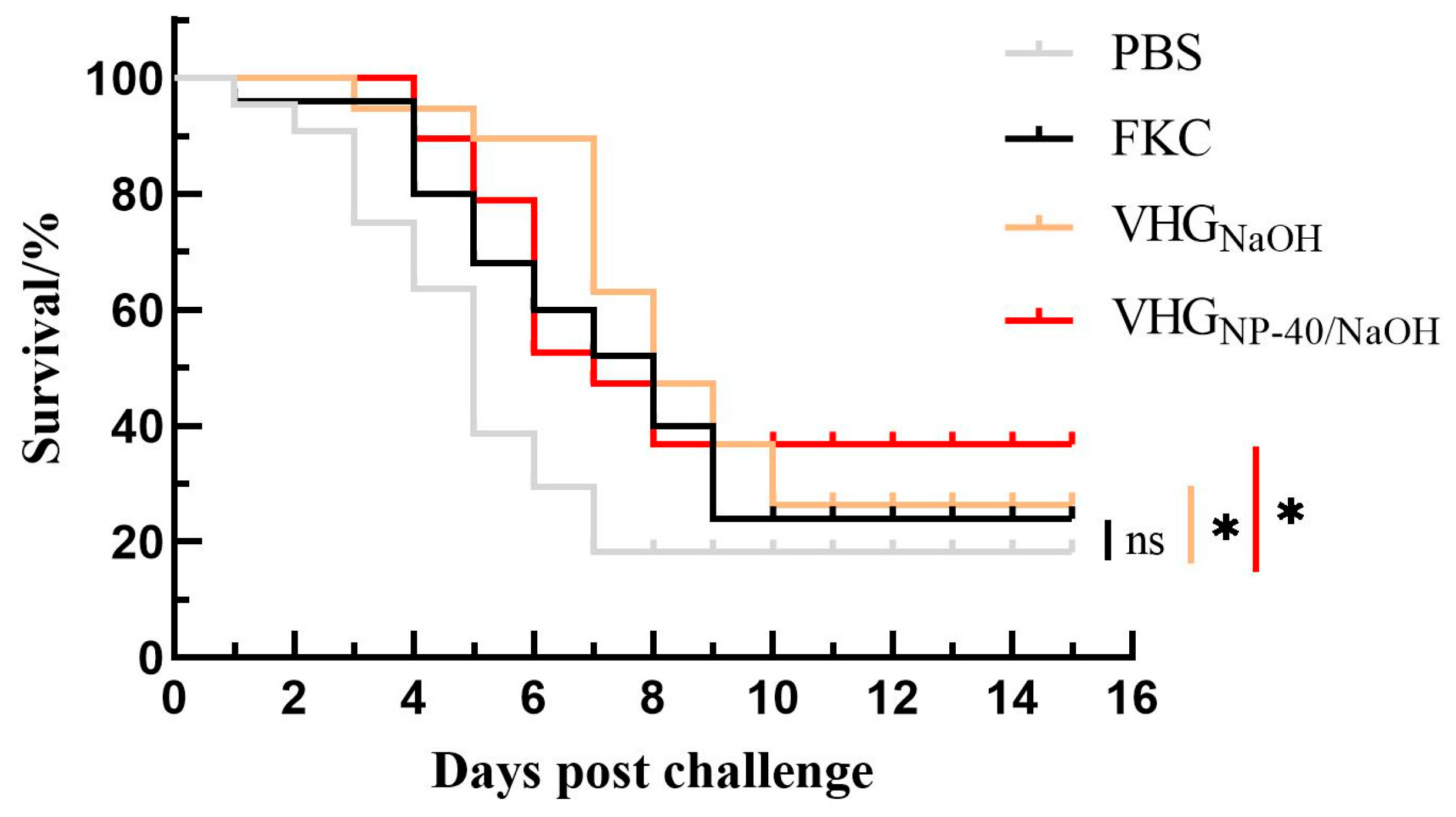 The immunoprotective efficacy of the prepared vaccines was evaluated in turbot. Fish were randomly divided into four groups with fifty fish per group. Three experimental groups received intraperitoneal injections of 100 μL containing VHGNaOH, VHGNP-40/NaOH and FKC vaccines, respectively, while the control group received 100 μL of PBS.