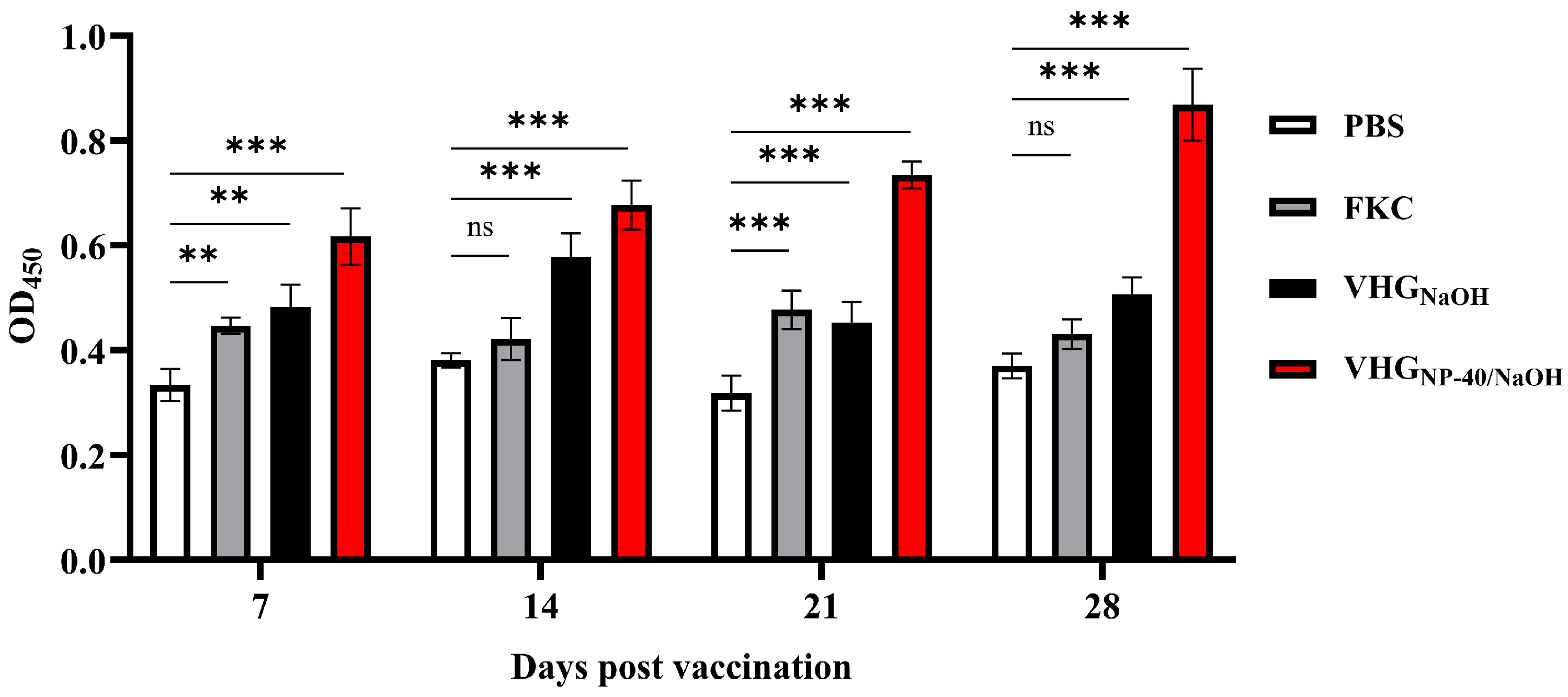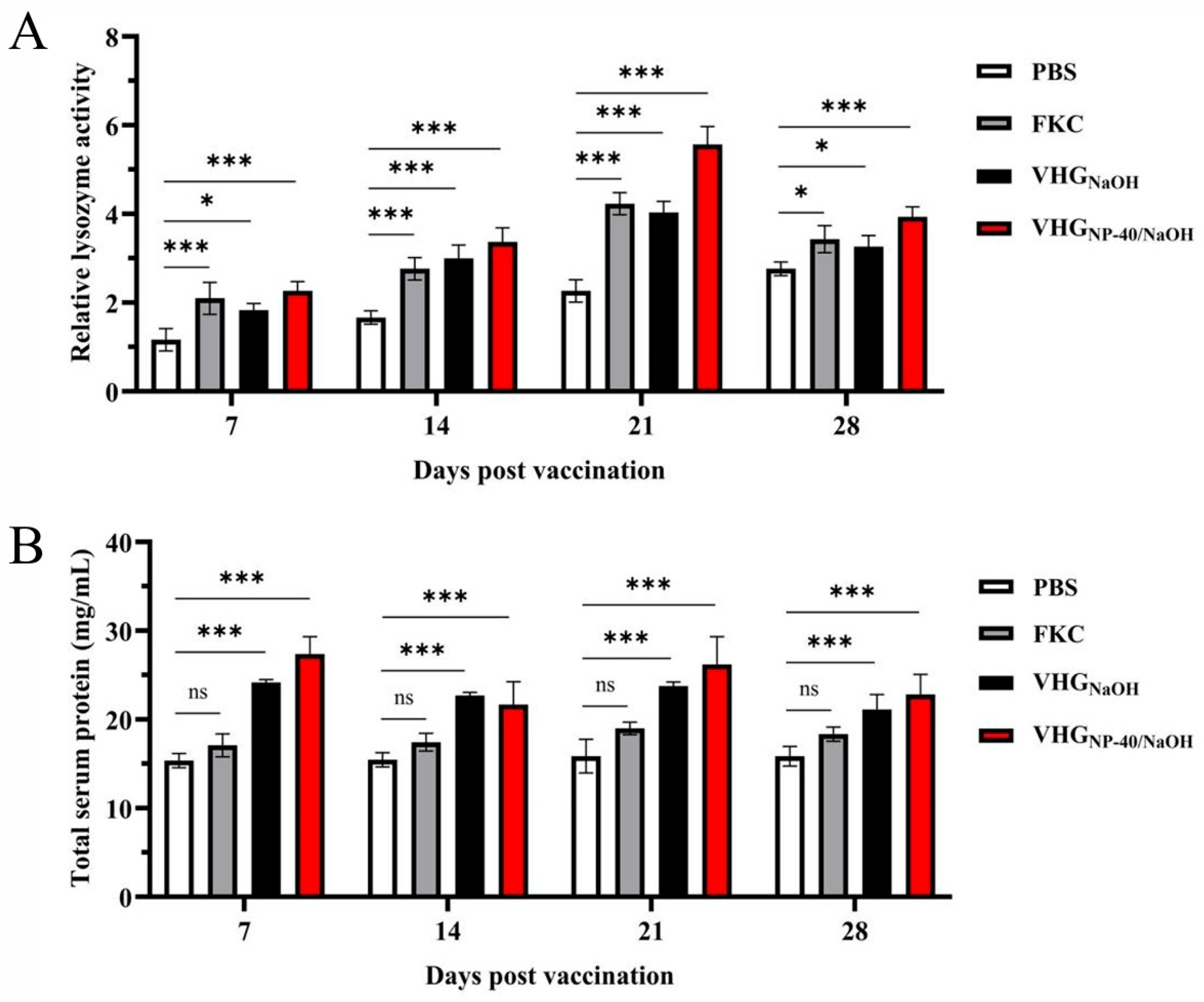 29]. Simultaneously, lysozyme activity, a key indicator of innate immune function primarily secreted by macrophages and neutrophils, showed marked elevation in all vaccine groups. The highest lysozyme activity in VHG