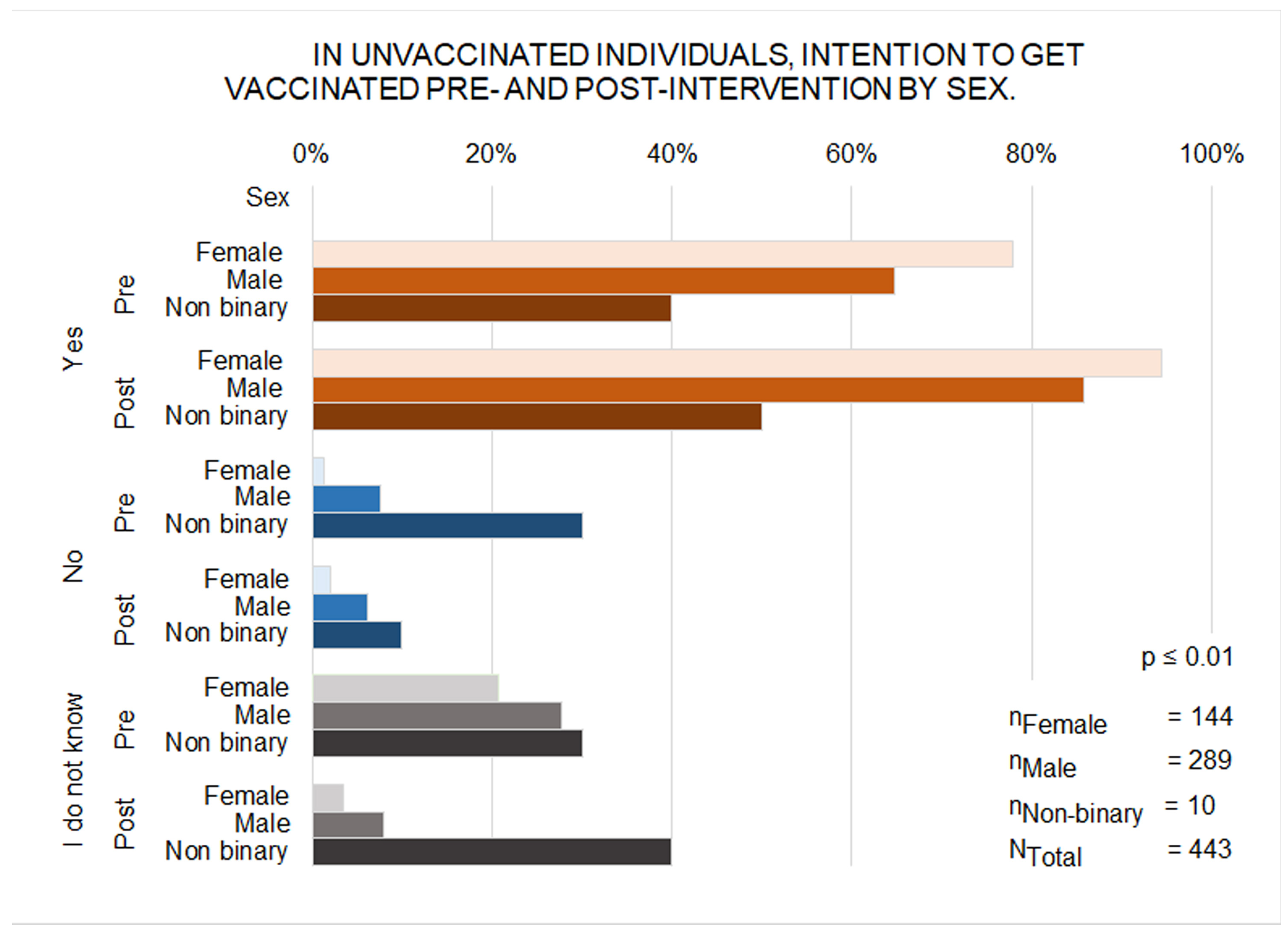 | Non-Vaccinated | Female | Pre-intervention | 112 (77.8%) | 2 (1.4%) | 30 (20.8%) | 144 |