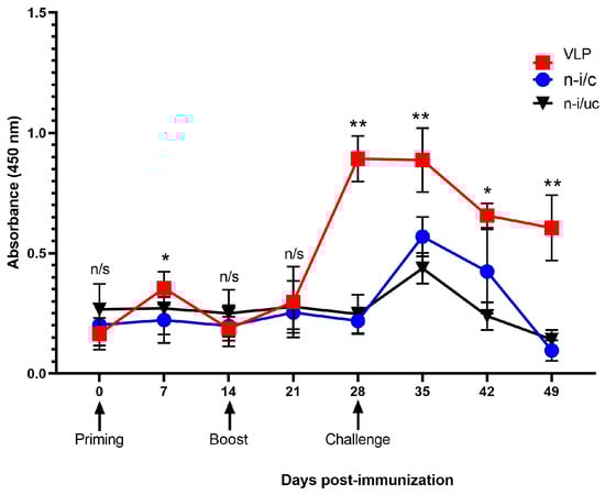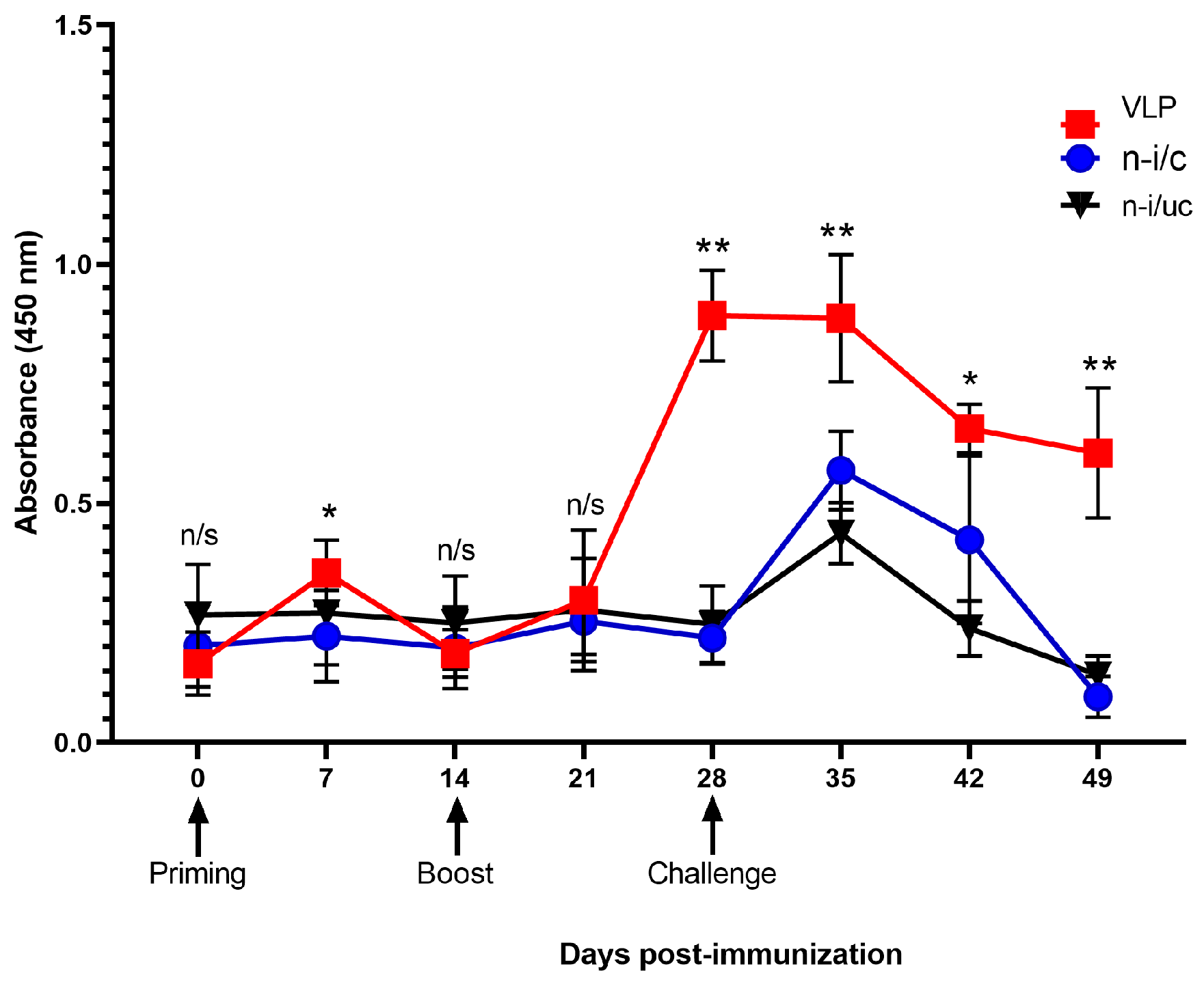 Figure 2. IgG antibody response in experimental groups after immunization and challenge. VLP: group immunized with chimeric VLPs carrying PCV2 Cap carboxy-terminal peptide; n-i/c: non-immunized/challenged group; n-i/uc: non-immunized/unchallenged group. Priming, boost immunization, and challenge days are shown with arrows. Statistically significant differences between the immunized group and the other groups were detected on days 7, 28, 35, 42, and 49, as determined by multiple t-test analysis. Significance is indicated as * p < 0.001 and ** p < 0.0001, n/s, not significant. Sample size was n = 10 for all time points, except for days 42 and 49 (n = 8).