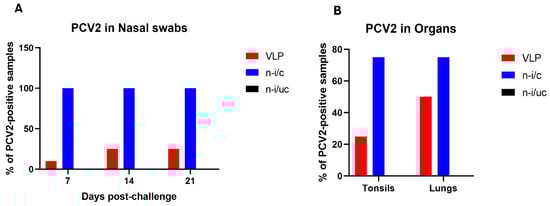 Figure 3. Percentage of PCV2-positive samples detected in experimental groups: (A) Percentage of PCV2-positive nasal swab samples at 7, 14, and 21 days post-challenge (d.p.c.) in the non-immunized/challenged (n-i/c), VLP-immunized, and non-immunized/unchallenged (n-i/uc) groups. (B) Percentage of PCV2-positive tonsil and lung samples collected at 21 d.p.c. in the same groups. Detection of PCV2 was performed by quantitative PCR (qPCR), and data are presented as the percentage of positive samples within each group (n = 8). Samples with a Ct value greater than 40 were considered negative.