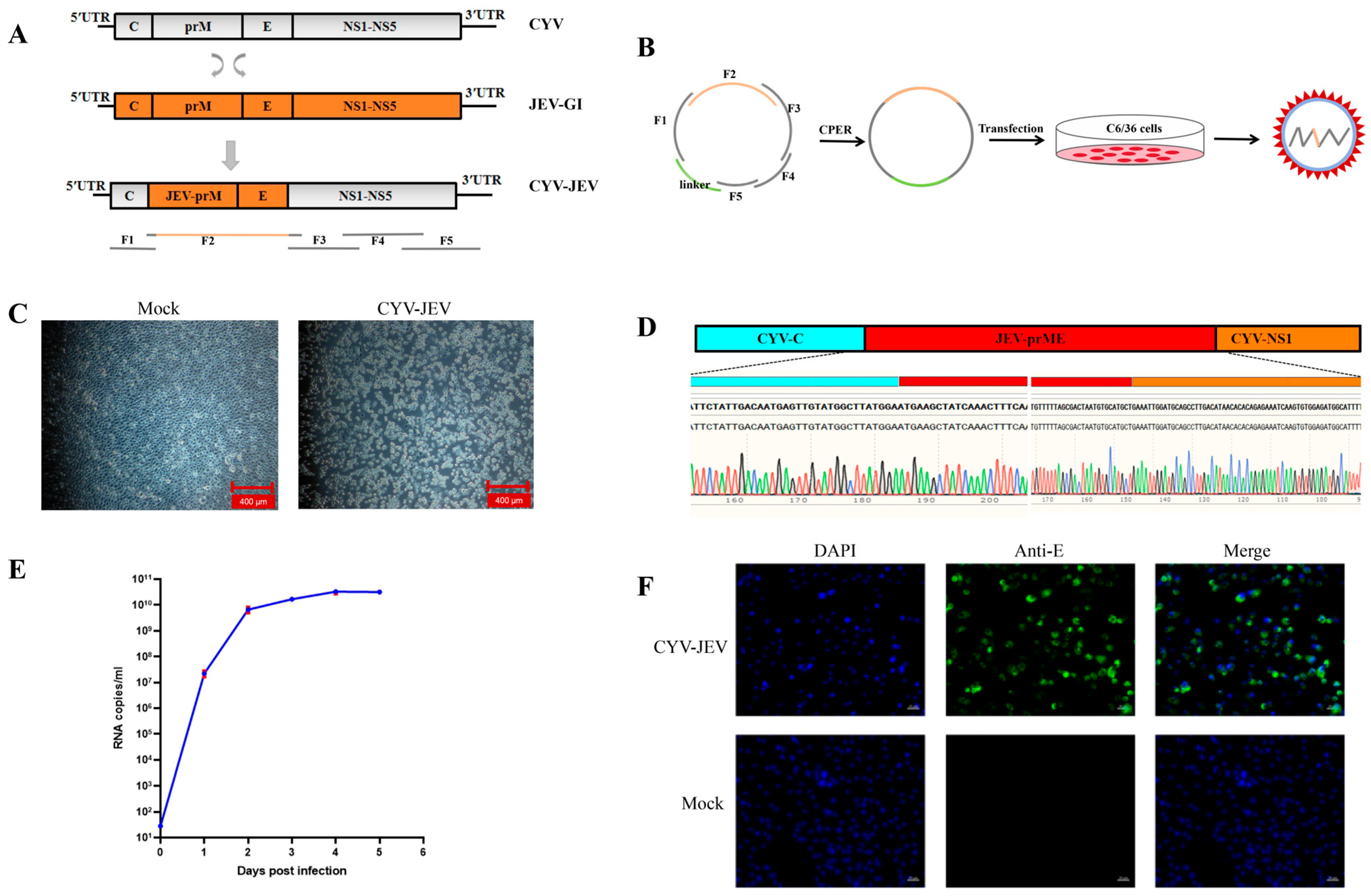 3.1. Rescuing Chimeric Virus CYV-JEV Using CPER Technology in Mosquito Cells