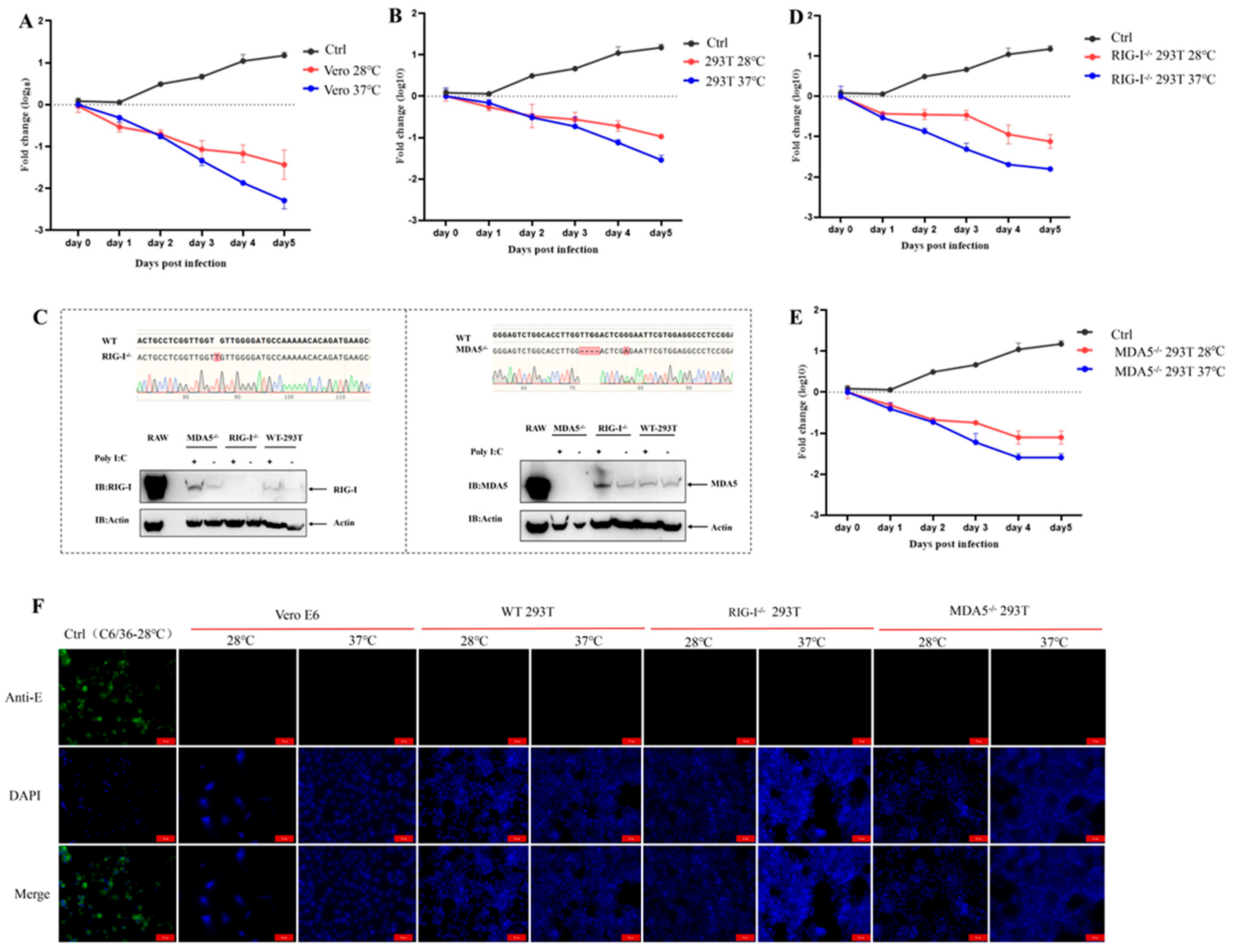 Vero, 293T, RIG-I−/− 293T, MDA5−/− 293T, and C6/36 cells grown in 24-well plates and confluent were inoculated with CYV-JEV at an MOI of 1 and incubated at 37 °C or 28 °C, respectively. After 3 days, cells were fixed and permeabilised with pre-cooled acetone-methanol (1:1) mixture for 10 min. Subsequently, cells were blocked with 1% BSA (in PBS) at 37 °C for 1 h. After blocking, cells were incubated with mouse monoclonal anti-yellow fever virus envelope protein antibody (1:200 dilution) at 37 °C for 1 h. After washing three times with PBS, cells were incubated with Alexa Fluor 488-labelled goat anti-mouse IgG secondary antibody (1:200 dilution) at 37 °C for 1 h. Finally, cell nuclei were stained with DAPI for 10 min. All fluorescence images were captured using a Zeiss Axio Observer inverted fluorescence microscope.
