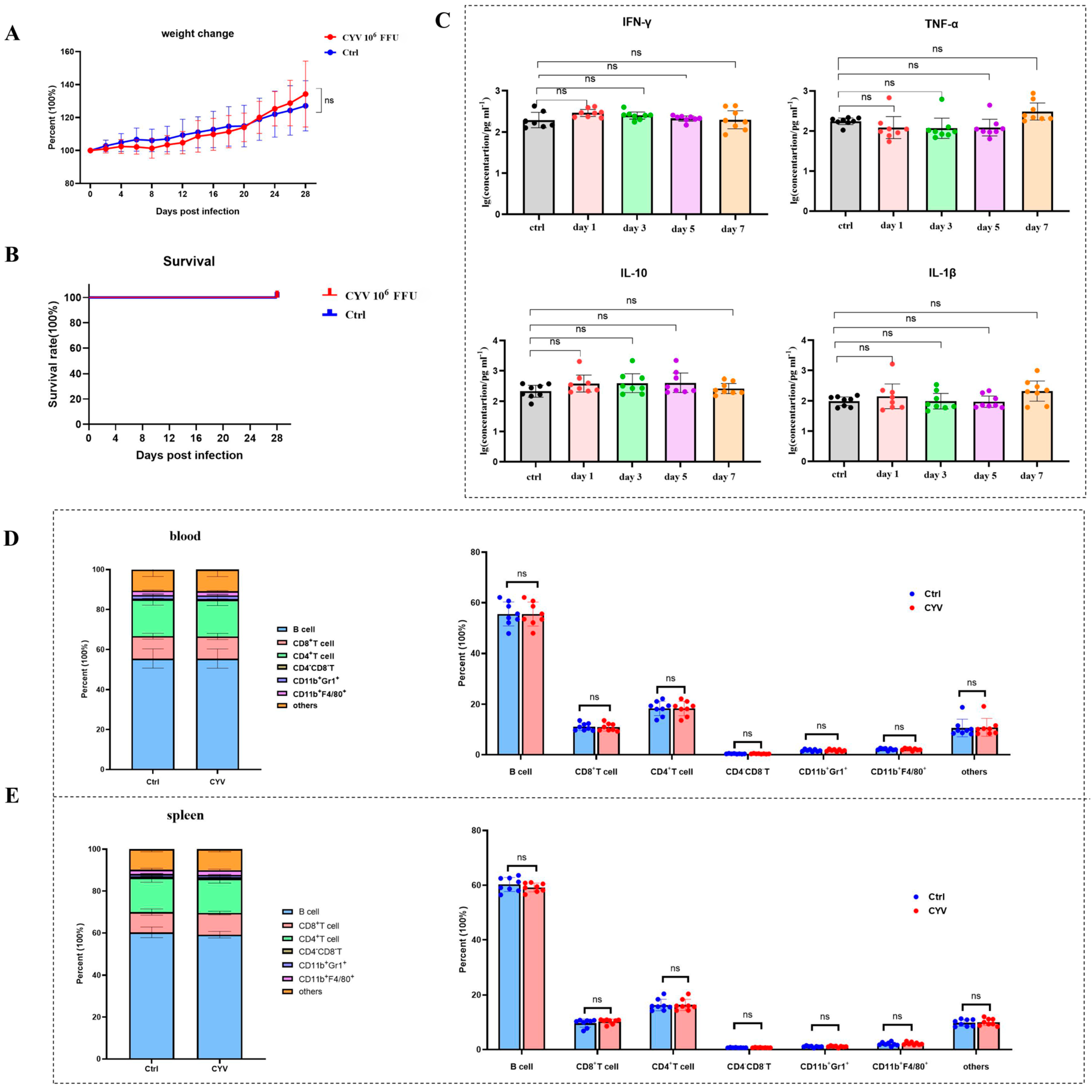 Figure 3C), suggesting that CYV inoculation did not provoke intense immune inflammatory responses. Mice were sacrificed on day 14, and the distribution of major immune cell subsets in peripheral blood and spleen was analysed by multicolour flow cytometry to further evaluate the impact of CYV on the immune system at the cellular level. Results showed no statistically significant differences in the proportions of key immune cells, including T cells, B cells, and macrophages, between the experimental and control groups in peripheral blood and spleen (