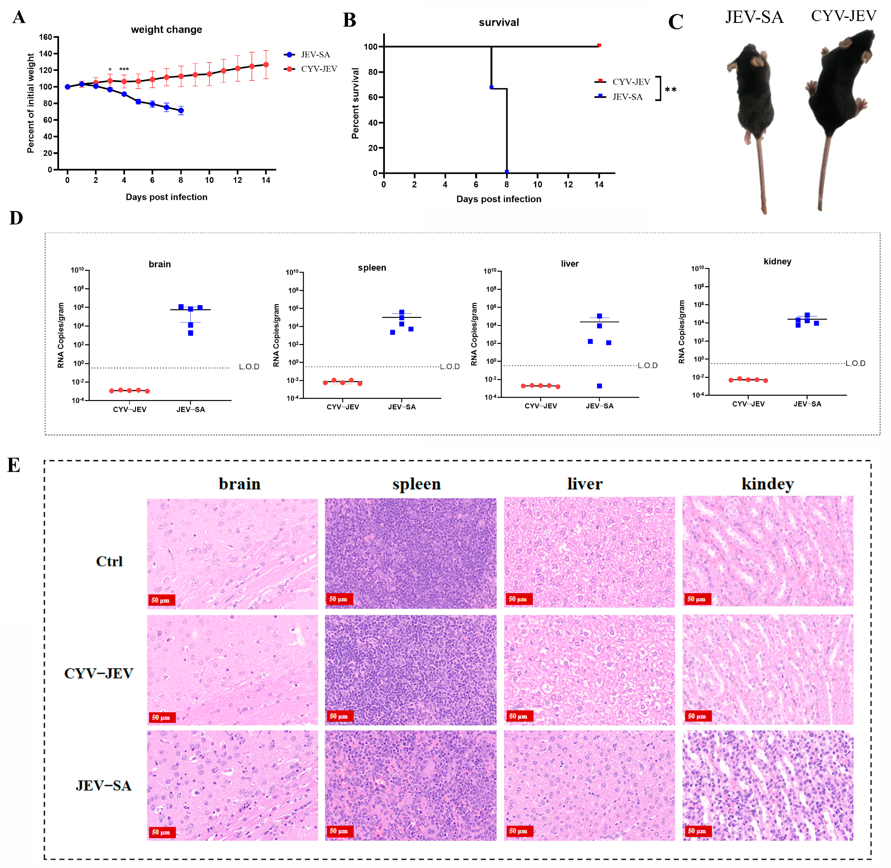 Six-week-old SPF-grade IFNAR−/− C57BL/6 mice were randomly divided into 2 groups (n = 5). Mice in both groups were intraperitoneally inoculated with 106 FFU of CYV-JEV strain and JEV SA 14-14-2 (abbreviated as JEV-SA). Body weight changes and mortality were monitored daily for 14 consecutive days. Mice inoculated with JEV died on the 7th or 8th day post-infection, and brain, spleen, liver, and kidney tissues were collected. Mice inoculated with JEV were euthanised after the 14-day monitoring period, and corresponding organs were collected. Viral nucleic acid content in tissues and organs was detected, and tissue HE staining was performed.