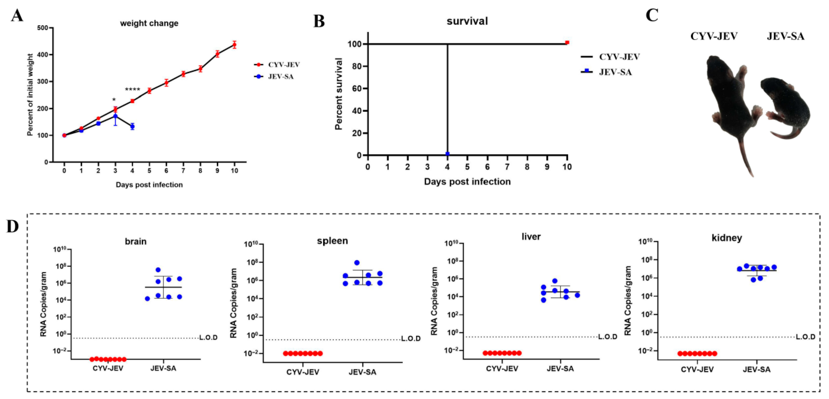 Figure 5D). In contrast, CYV-JEV-inoculated mice exhibited a four-fold body weight increase during the 10-day observation period, with no infection signs or mortality, and no viral nucleic acid detected in key tissues (