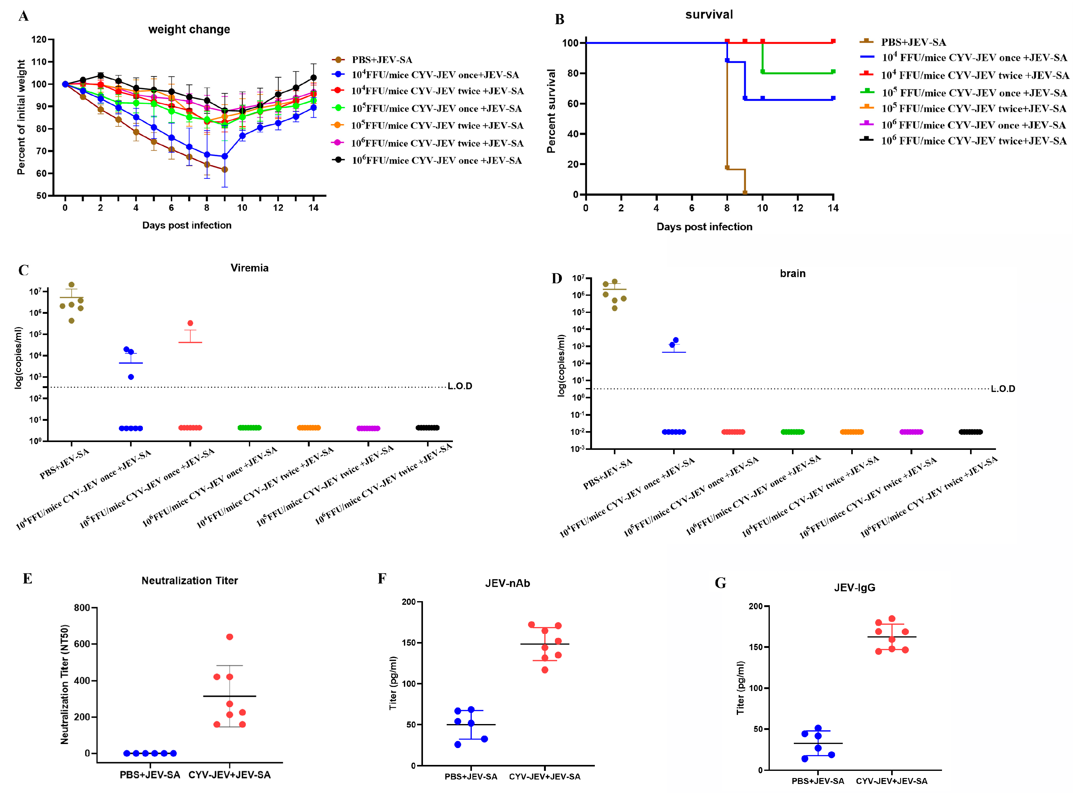 Results showed that all CYV-JEV-immunised groups experienced temporary body weight reduction following viral challenge, which gradually recovered (