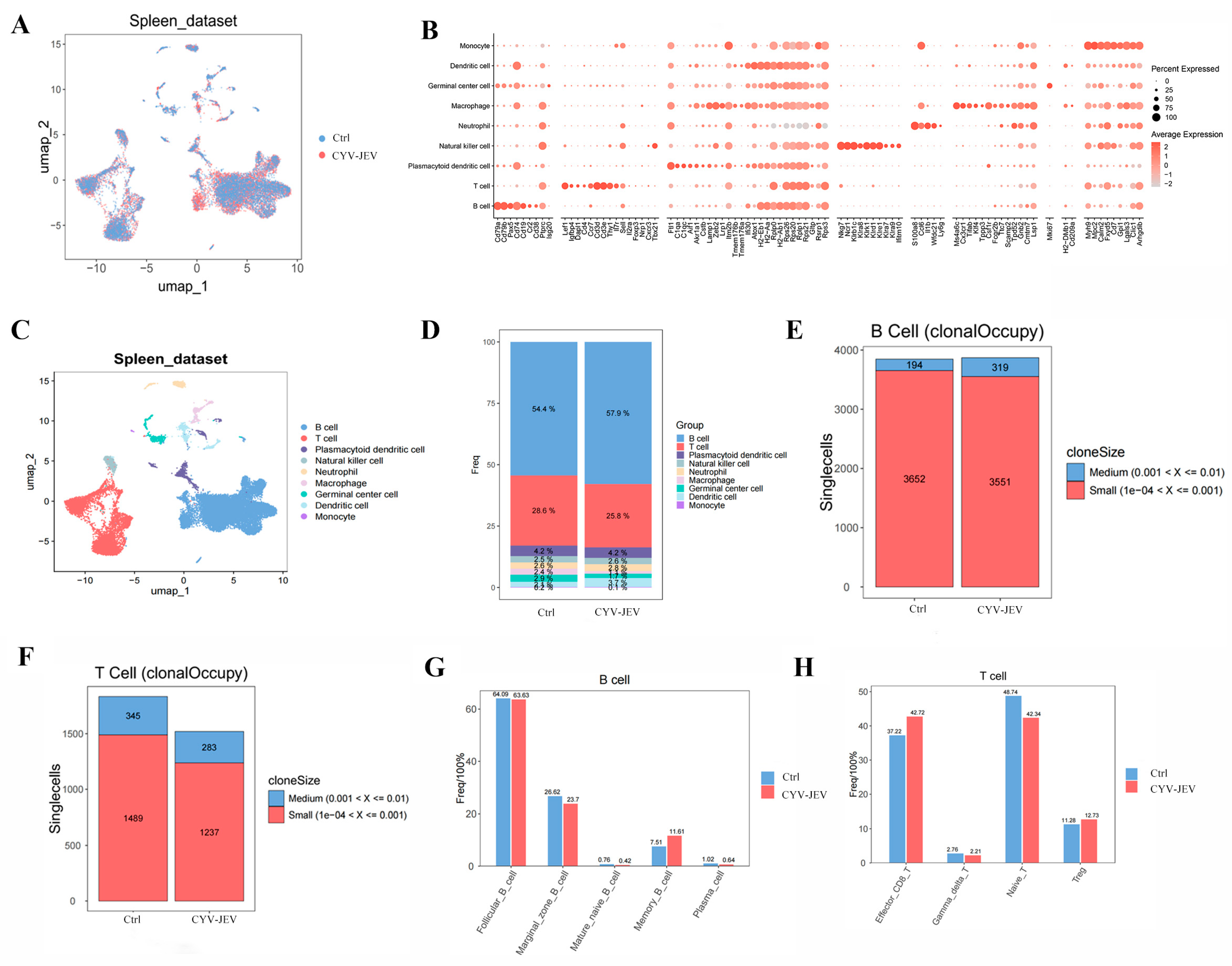 Figure 7A–D). The results showed that, compared with the control group, the total T-cell quantity decreased in the CYV-JEV-immunised group (from 28.6% to 25.8%), whilst the total B-cell quantity increased (from 54.4% to 57.9%). Further analysis of B-cell receptors (BCR) demonstrated that CYV-JEV immunisation prompted some B-cell populations originally belonging to the “small clone” category to proliferate to the “medium clone” category (small clone number reduced from 3652 to 3551, whereas medium clone number increased from 194 to 319), suggesting that CYV-JEV immunisation activated humoral immune responses (