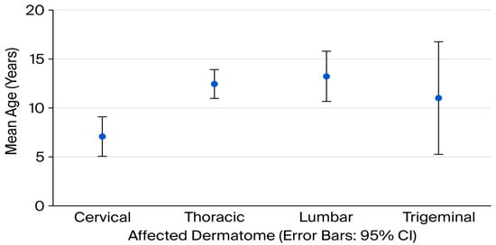Mean age (years) according to affected dermatome in pediatric herpes zoster patients (error bar chart).