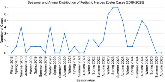 Seasonal and annual distribution of pediatric herpes zoster cases (2018–2025 (only first 4 months)).