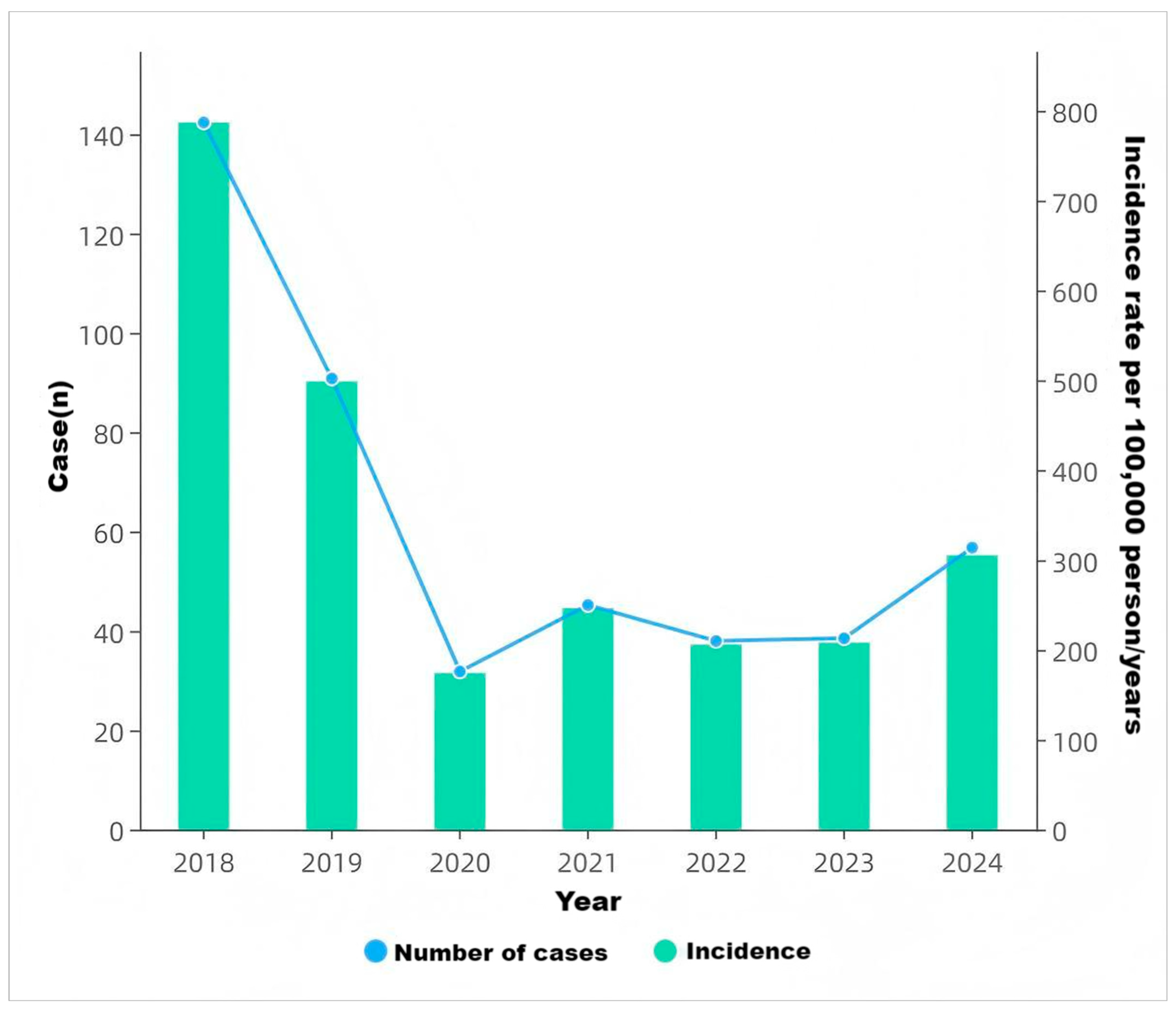 Figure 1. Varicella case counts and incidence rates in Yanji city from 2018 to 2024.