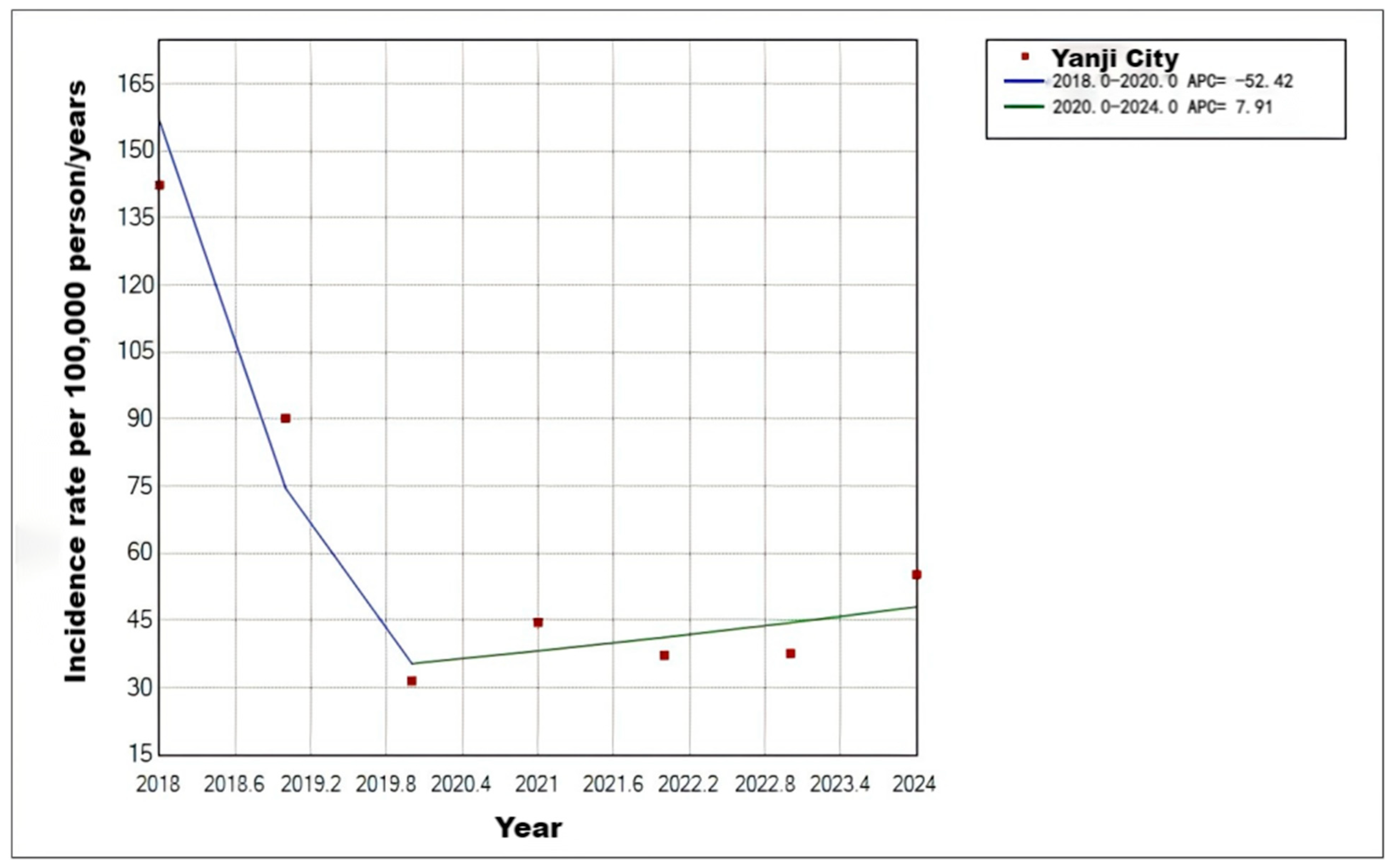 Figure 2. Trends in varicella incidence rates in Yanji city from 2018 to 2024.