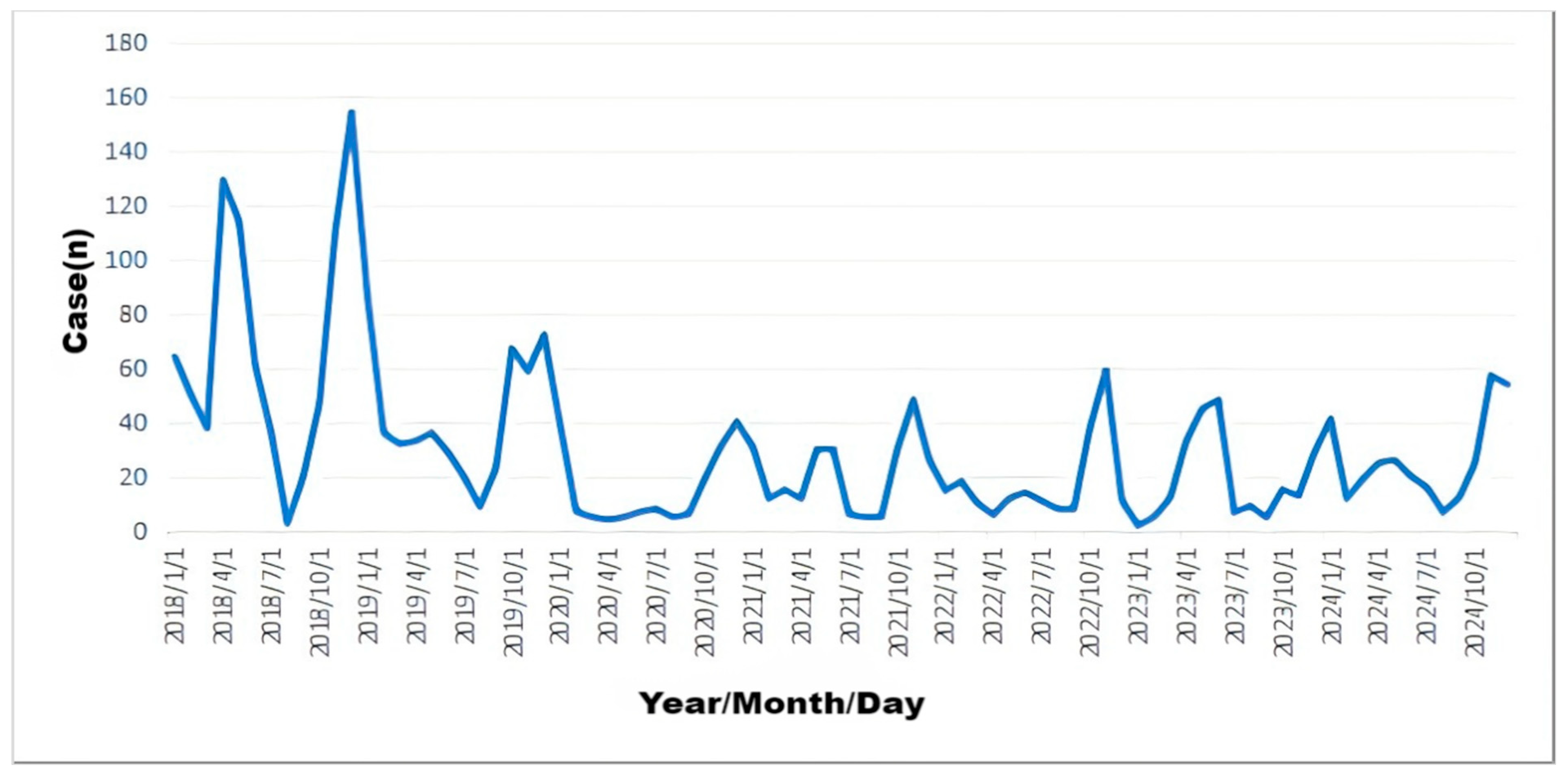 Varicella case data were obtained from the China Disease Prevention and Control Information System and the Infectious Disease Reporting System. Varicella cases were filtered for residents of Yanji with onset dates of 1 January 2018, to 31 December 2024, totaling 2452 confirmed cases, excluding suspected cases. Additionally, varicella vaccination data from 2018 to 2020 were collected for this study.