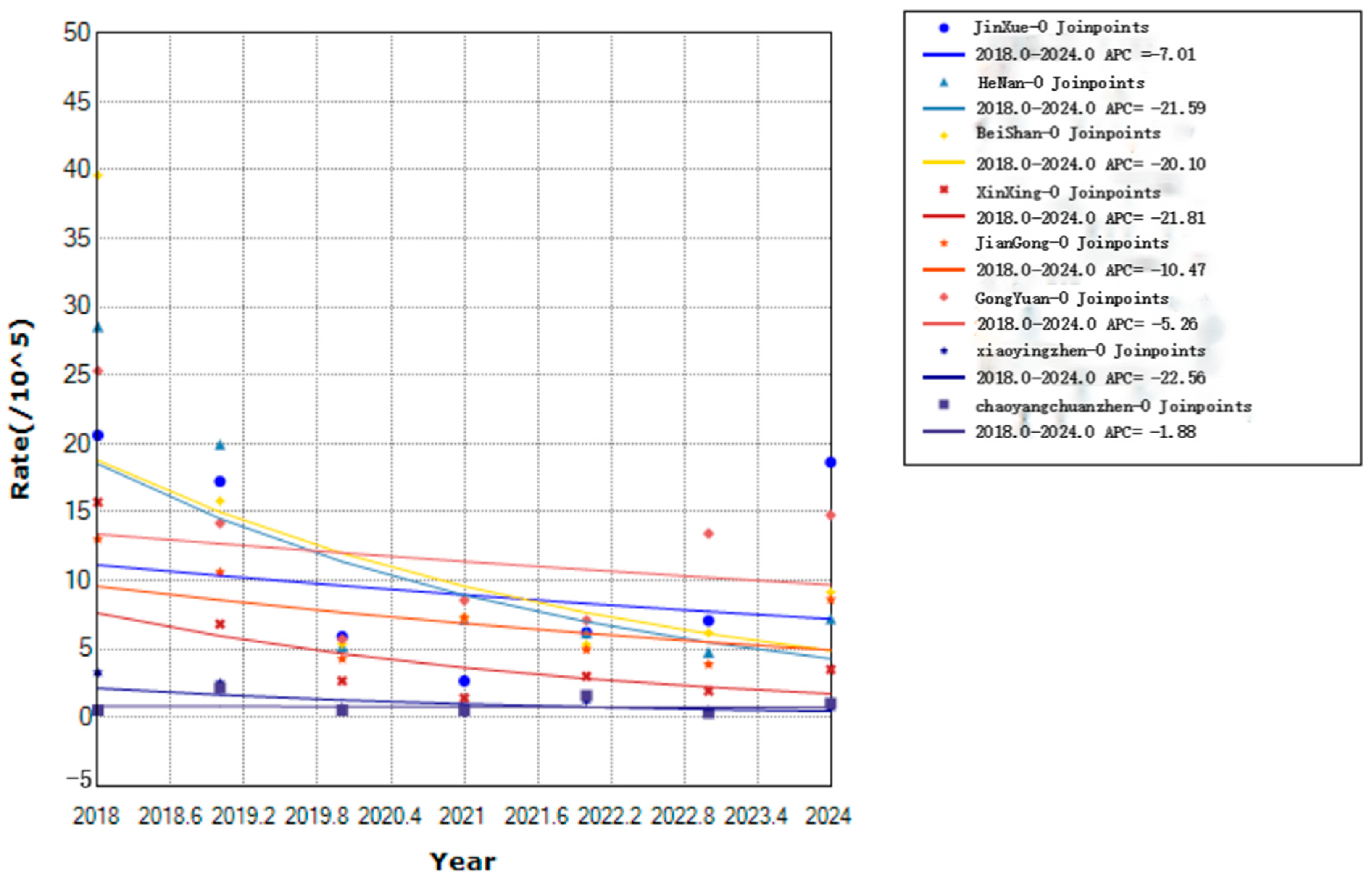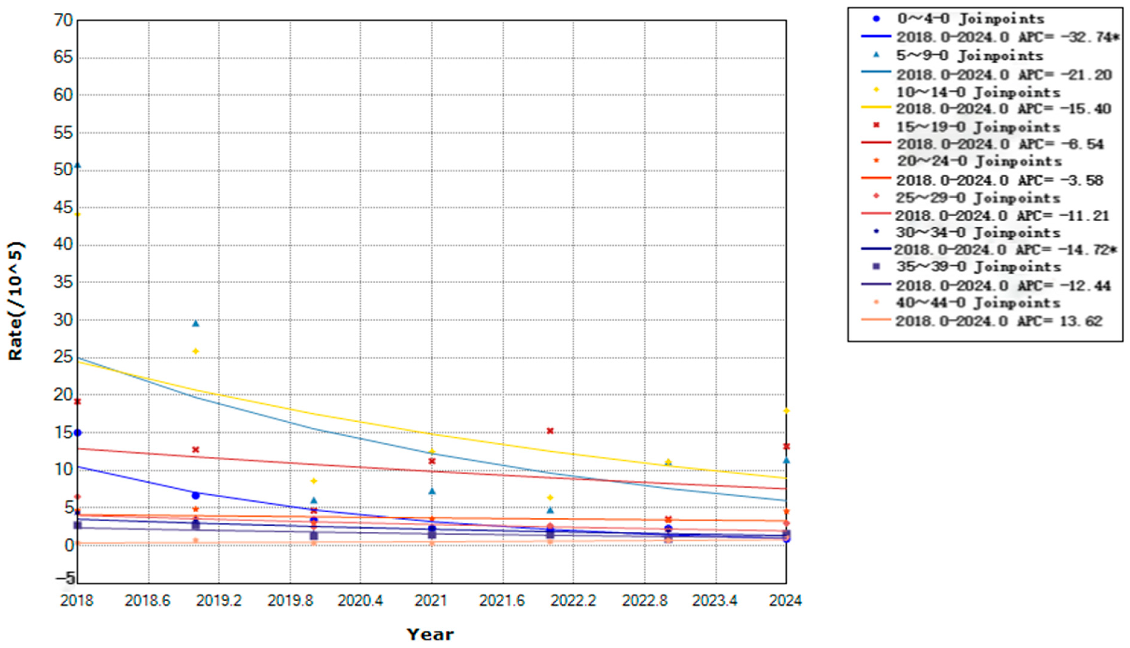 Figure 6. Trends in varicella incidence rates by age group in Yanji city from 2018 to 2024. * Indicates that the Annual Percent Change (APC) is significantly different from zero at the alpha = 0.05 level.