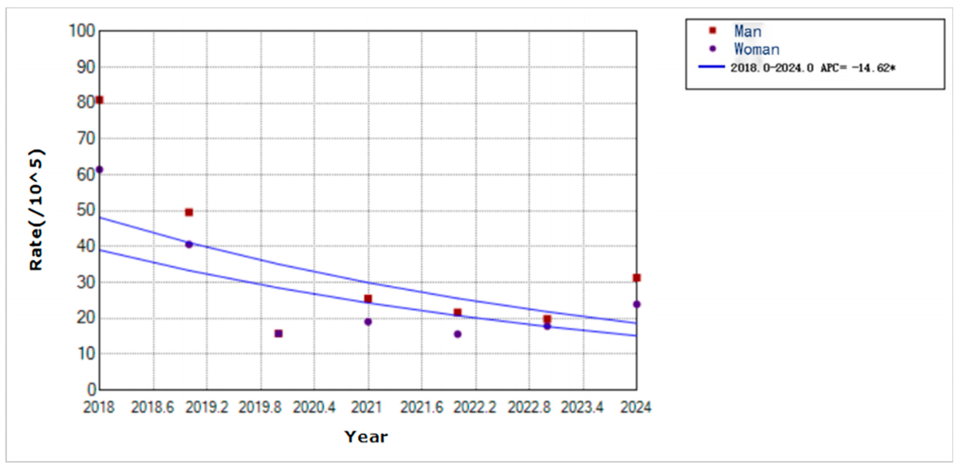 Figure 5. Trends in varicella incidence rates by sex in Yanji city from 2018 to 2024. * Indicates that the Annual Percent Change (APC) is significantly different from zero at the alpha = 0.05 level.