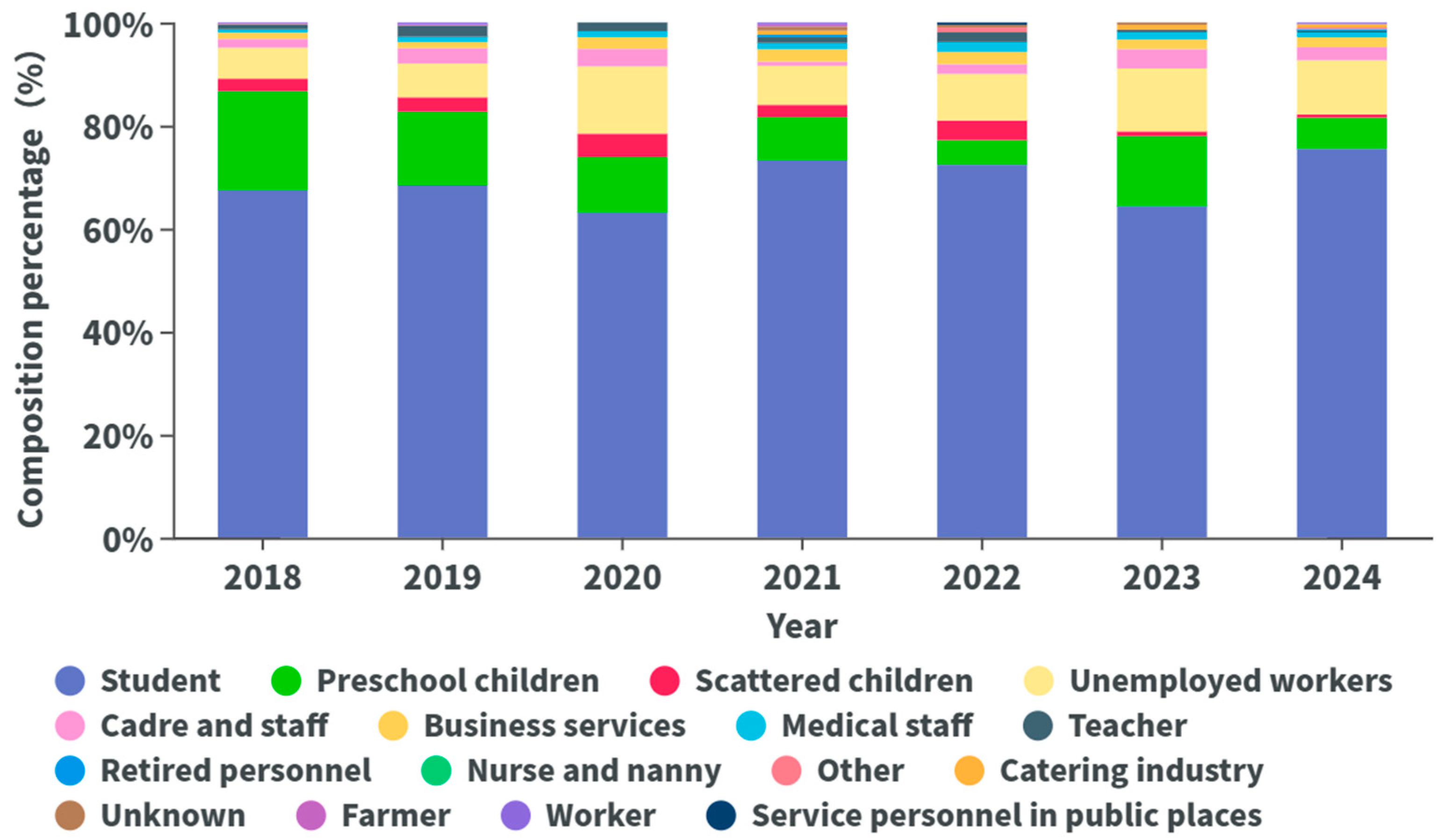 Figure 7. Occupational distribution of varicella cases in Yanji city from 2018 to 2024.