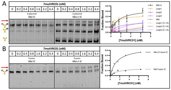 Gel shift assays with VRC01 revertant and affinity matched non-VRC01 antibody A32. (A) Representative gel shift assay for fusion 48d IC and 48d.cl IC with 2mutVRC01. (B) Representative gel shift assay for fusion 48d IC and 48d.cl IC with 3mutA32. All datapoints were run in triplicate and expressed as standard deviations.