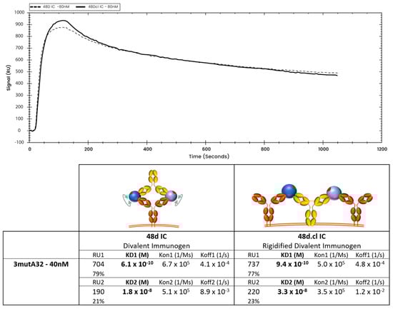 At low ligand density (loading 1.25 nM 3mutA32 on the SPR chip), crosslinked 48d.cl IC exhibited a rapid initial dissociation consistent with mostly monovalent binding followed by tighter binding species consistent with divalent binding (Figure 8 and Figure S5A). In contrast, non-Fab-Fab-crosslinked control IC showed tight binding and a slow dissociation consistent with mostly divalent binding (Figure 8 and Figure S5B). A logical interpretation of this is that there is a minor population of 48d.cl that exhibits divalent binding, despite poor divalent binding as observed in the gel shift assay. This component is most easily explained by (1) the portion of the 48d.cl IC which is not crosslinked, estimated to be 5–20%, and which is also visible in the gel shift assay, and (2) divalent binding to two adjacent immobilized 3mutA32 antibodies on the SPR sensor that were close enough for the divalent immunogen to bind both antibodies simultaneously. In agreement with the latter, increasing the density of immobilized 3mutA32 ligand (loading with 40 nM Ab), results in nearly all the 48d.cl IC binding strongly (Figure 9). Reducing A32 ligand density resulted in lower divalent binding behavior but also lower SPR signal and greater noise. We found that the lower bound 3mutA32 ligand density for reliable signal was accomplished by loading with ~1 nM antibody.