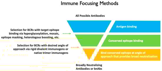 This study represents a new approach to immune focusing. It differs from most other immune focusing approaches in that in addition to selecting for BCRs that bind the target epitope, it also imposes an angle of approach requirement (Figure 10). In contrast to a previous HIV-1 Env–antibody complex aiming to focus responses by masking variable epitopes [54], our design rigidly and precisely positions two antigens for selective divalent binding, thereby directly targeting VRC01-class B cell receptors. Importantly, the selective avidity design accommodates existing immune focusing methods such as simultaneous incorporation of distant gp120s [55,56] and hyperglycosylation [57,58].