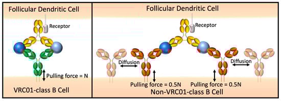 Representation of immune synapse between the divalent immunogen and a VRC01-class BCR vs. a non-VRC01-class BCR.