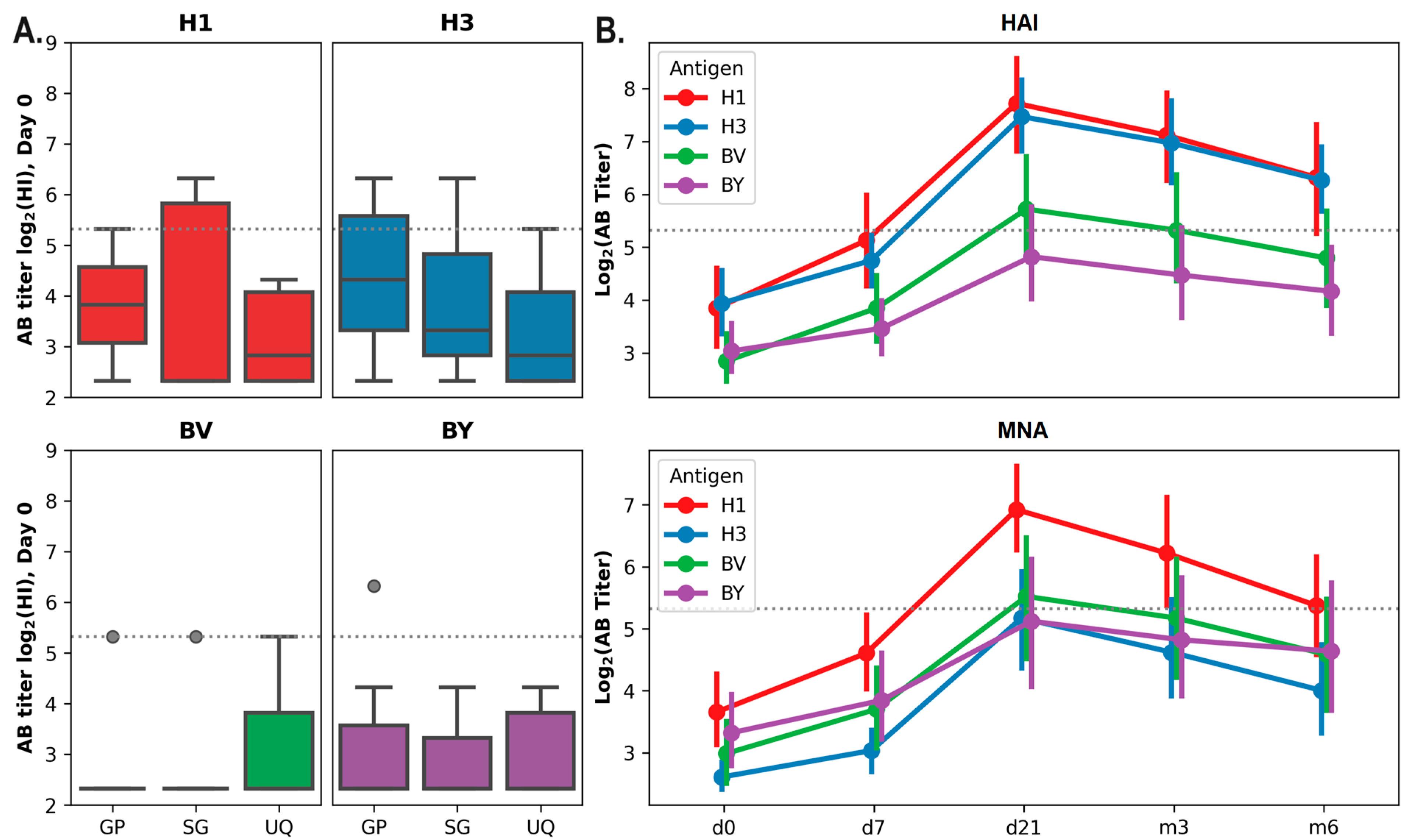 | Fold increase in AB titers, Day 28 (CI) | H1 | 13.7 (7.2, 26) | 6.9 (4.2, 11.4) | 11.5 (5.7, 23.2) |