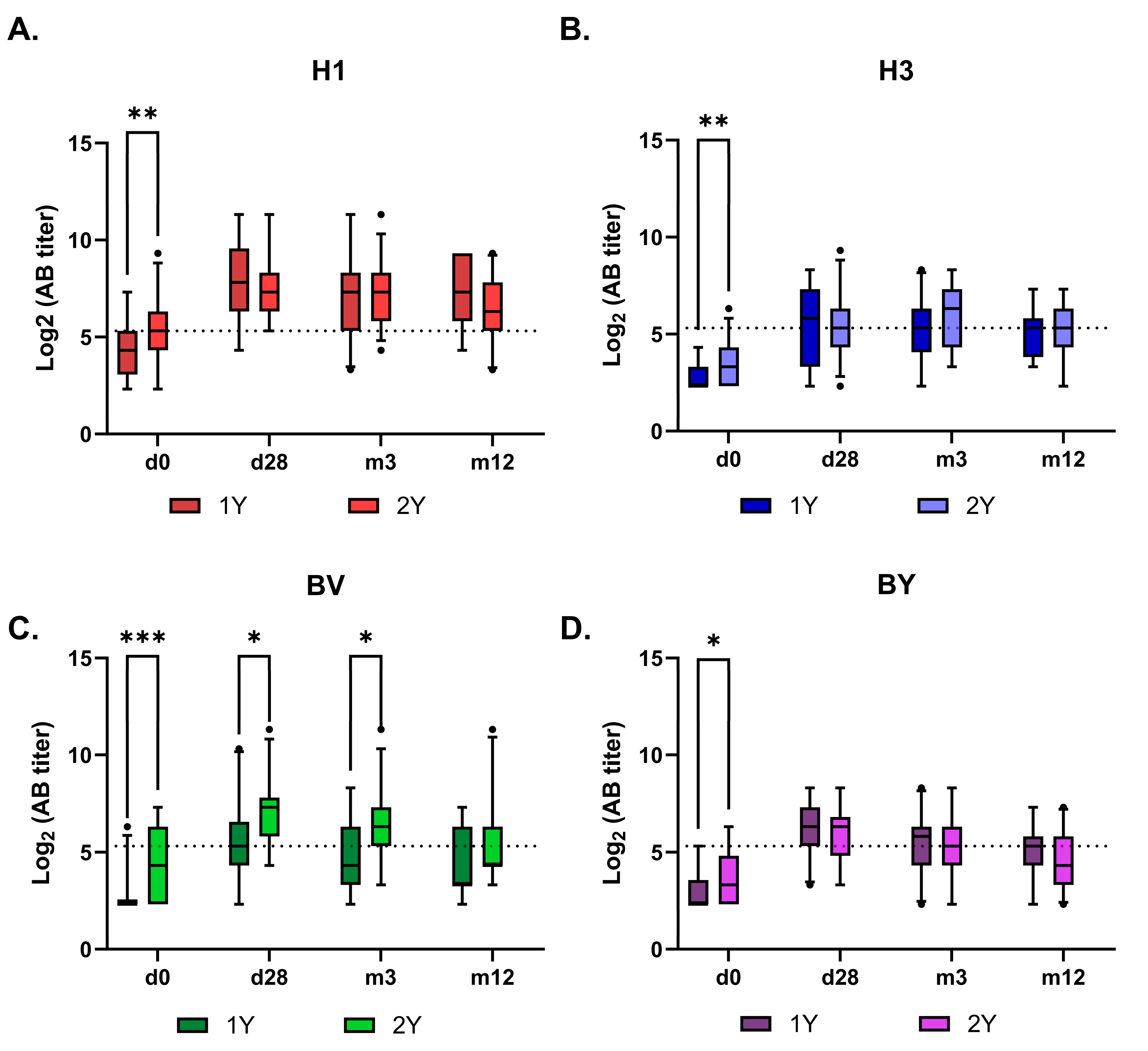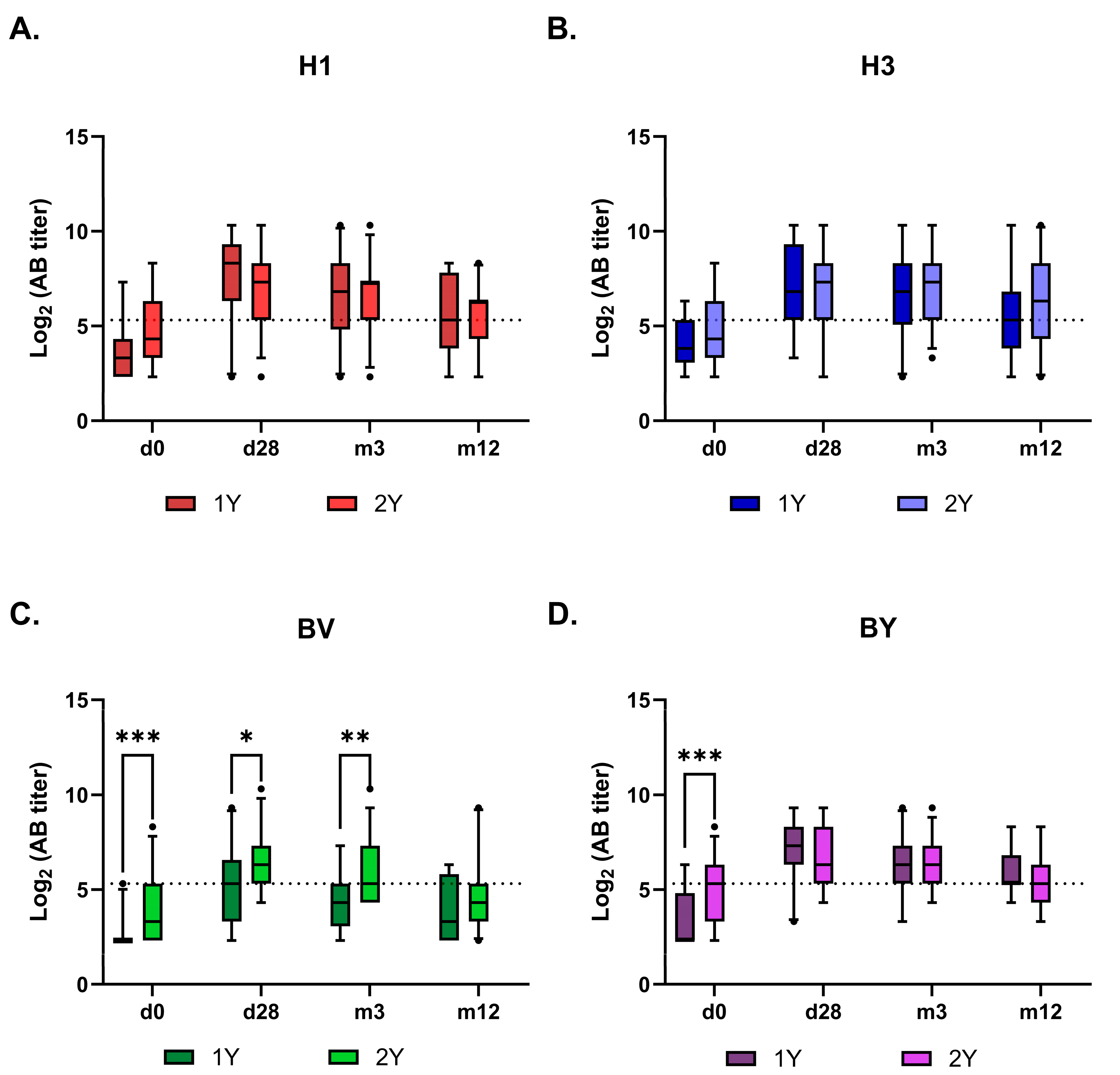 | Fold increase in AB titers, Day 28 (CI) | H1 | 6.9 (4.9, 9.8) | 15.5 (8.5, 28) | 4.6 (3.1, 6.9) | >2 |