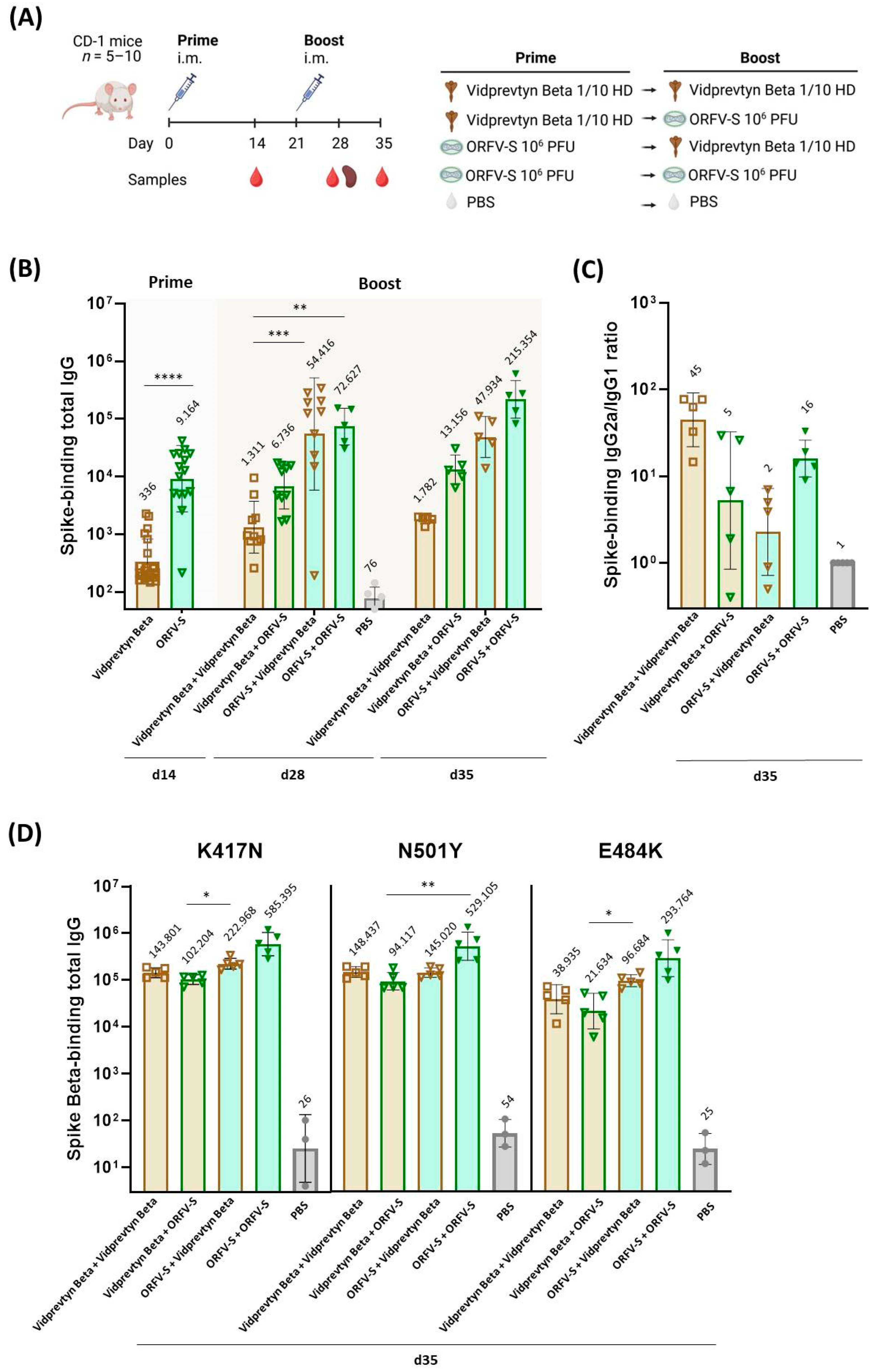 - Reguzova, A.; Haug, V.; Müller, M.; Fandrich, M.; Dulovic, A.; Amann, R. Heterologous ORFV–Ad26 vaccination broadens antibody breadth and amplifies cellular immunity against SARS-CoV-2 spike. Front. Immunol. 2025, 16, 1715442. [Google Scholar] [CrossRef] [PubMed]