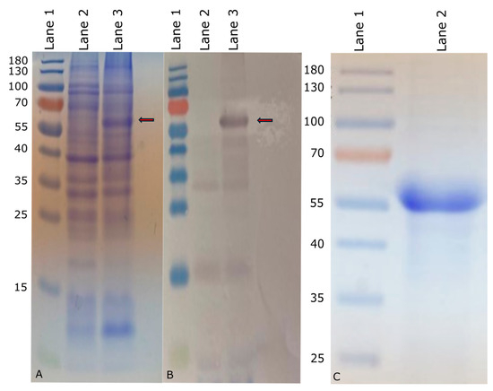 Expression of InvG in M15 E. coli (marked with red arrow). (A) Coomassie-stained SDS-PAGE of expressed InvG. (B) Western blot of expressed InvG. Lane1: PageRuler™ prestained protein ladder (Thermo Fisher Scientific) marked in kDa; Lane 2: Uninduced bacterial culture (negative control); Lane 3: Bacterial culture induced with IPTG. (C) Purified InvG on Coomassie-stained SDS-PAGE. Lane 1: PageRuler™ prestained protein ladder (Thermo Fisher Scientific) marked in kDa; Lane 2: Nickel-nitrilotriacetic acid (Ni-NTA)-purified InvG.