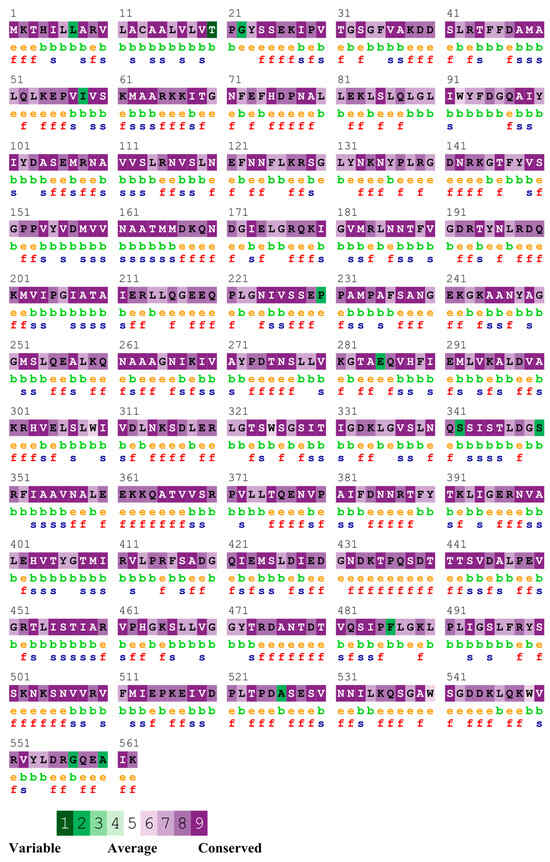 Sequence conservation of InvG across the serovars. e—An exposed residue according to the neural network algorithm; b—a buried residue according to the neural network algorithm; f—a predicted functional residue (highly conserved and exposed); s—a predicted structural residue (highly conserved and buried).